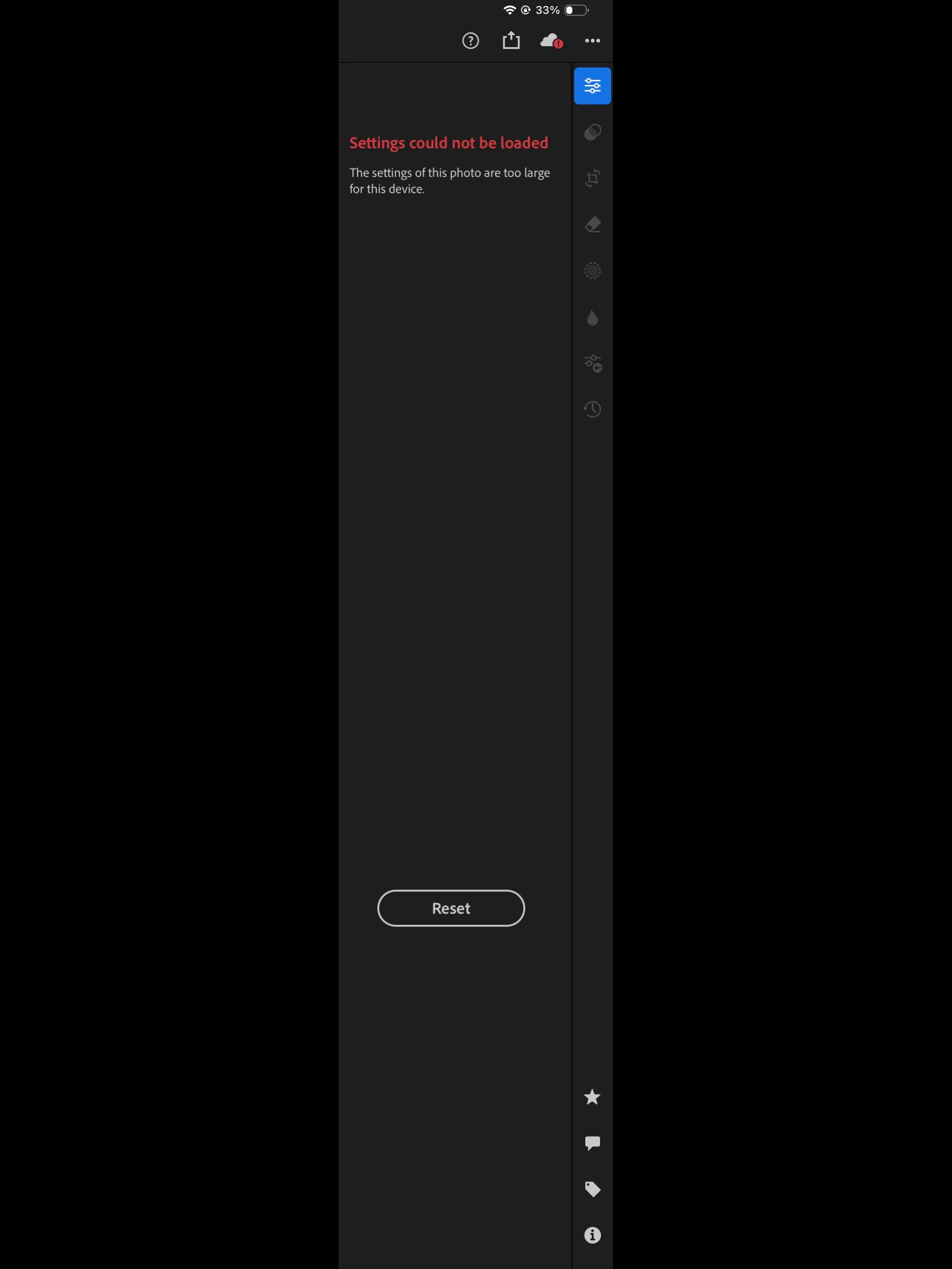 Settings could not be loaded. The settings of this photo are too large for this device.