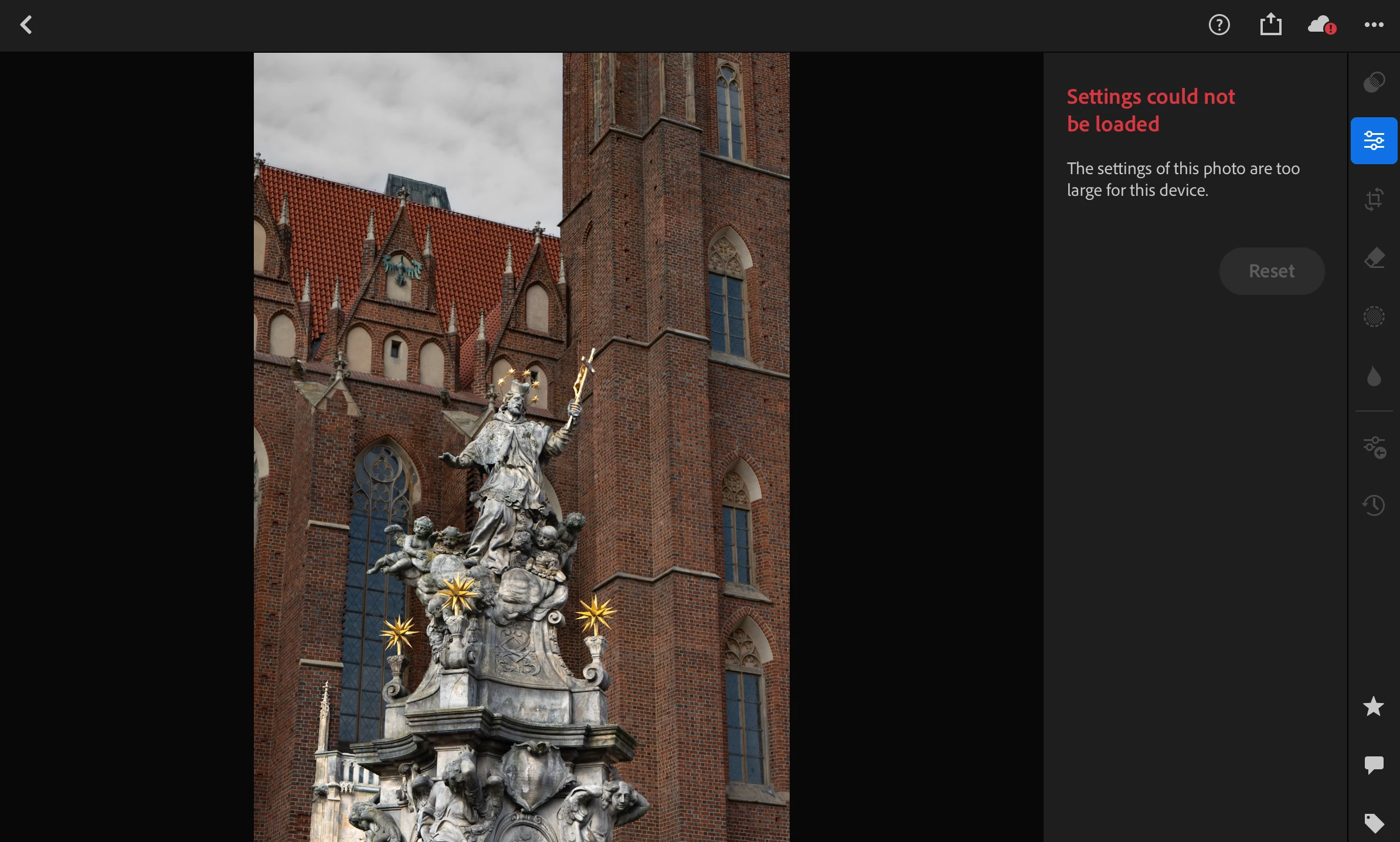Settings could not be loaded. The settings of this photo are too large for this device. Lightroom