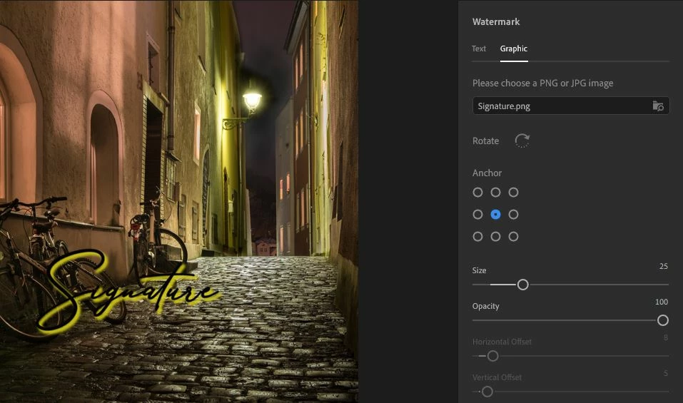 When you Share/Export an image choose 'Custom Settings' where you can check the box for a watermark and click on the cog-wheel for text or graphic options. You can create your signature (PNG or JPG) graphic and be creative in Photoshop.