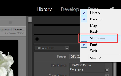 I think you are asking about the traditional version LrC (LR Classic). If that is the case then Right Click on the one of the other headings and from the POPUP menu select Slideshow.