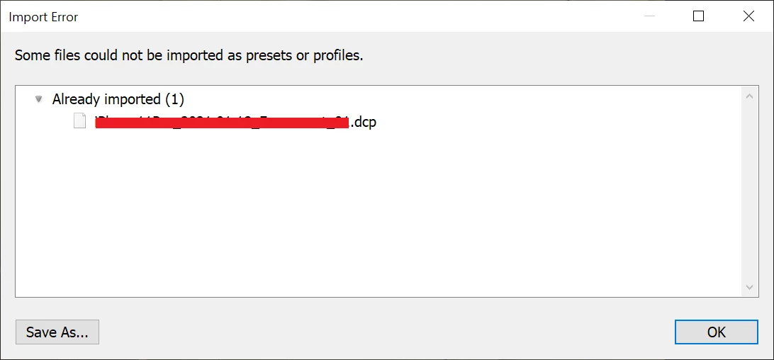 If I attempt to import the profiles again, I get an error message saying "Some files could not be imported as presets or profiles." and the profile(s) I attempted to import are shown as already imported. I also see no