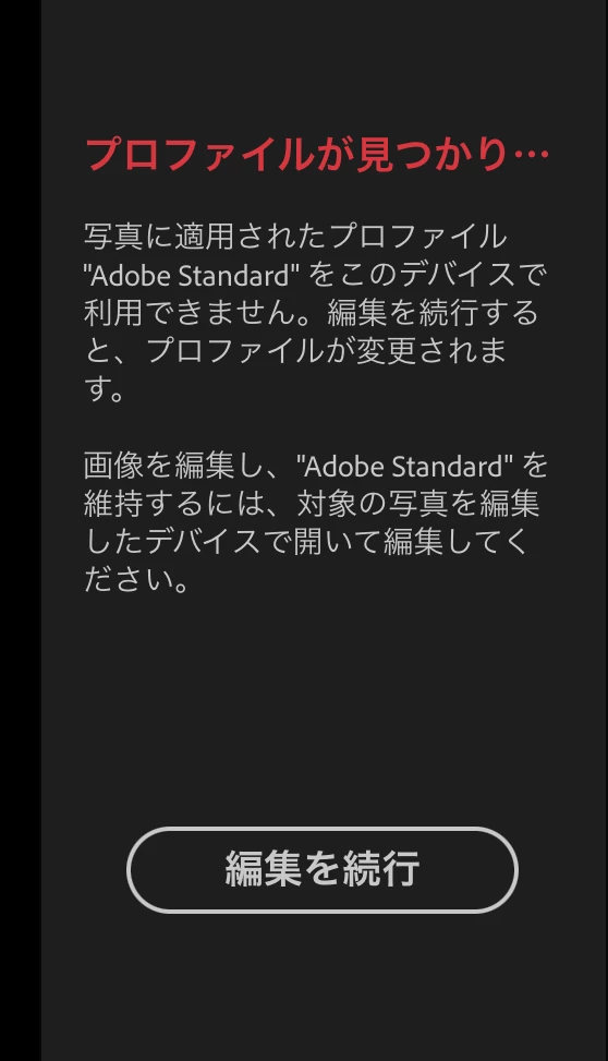 SONYα7Ⅳで撮影した写真をiPad版Lightroomで編集しようとすると画像のような、『プロファイルが見つかりません』と表示されます。