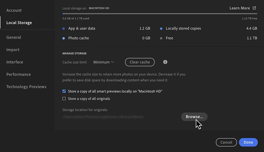 Just subscribed to Lightroom (ver. 5.6) I have set the preferences to minimum storage on my hard drive as i only want to store photos in the cloud, but when i am trying to upload them it is still using the hard drive AND telling me i cant continue as i dont have enough space on the hard drive, probably because i have set it to minimum so how do i turn it off altogether and use only the cloud storage? thanks.