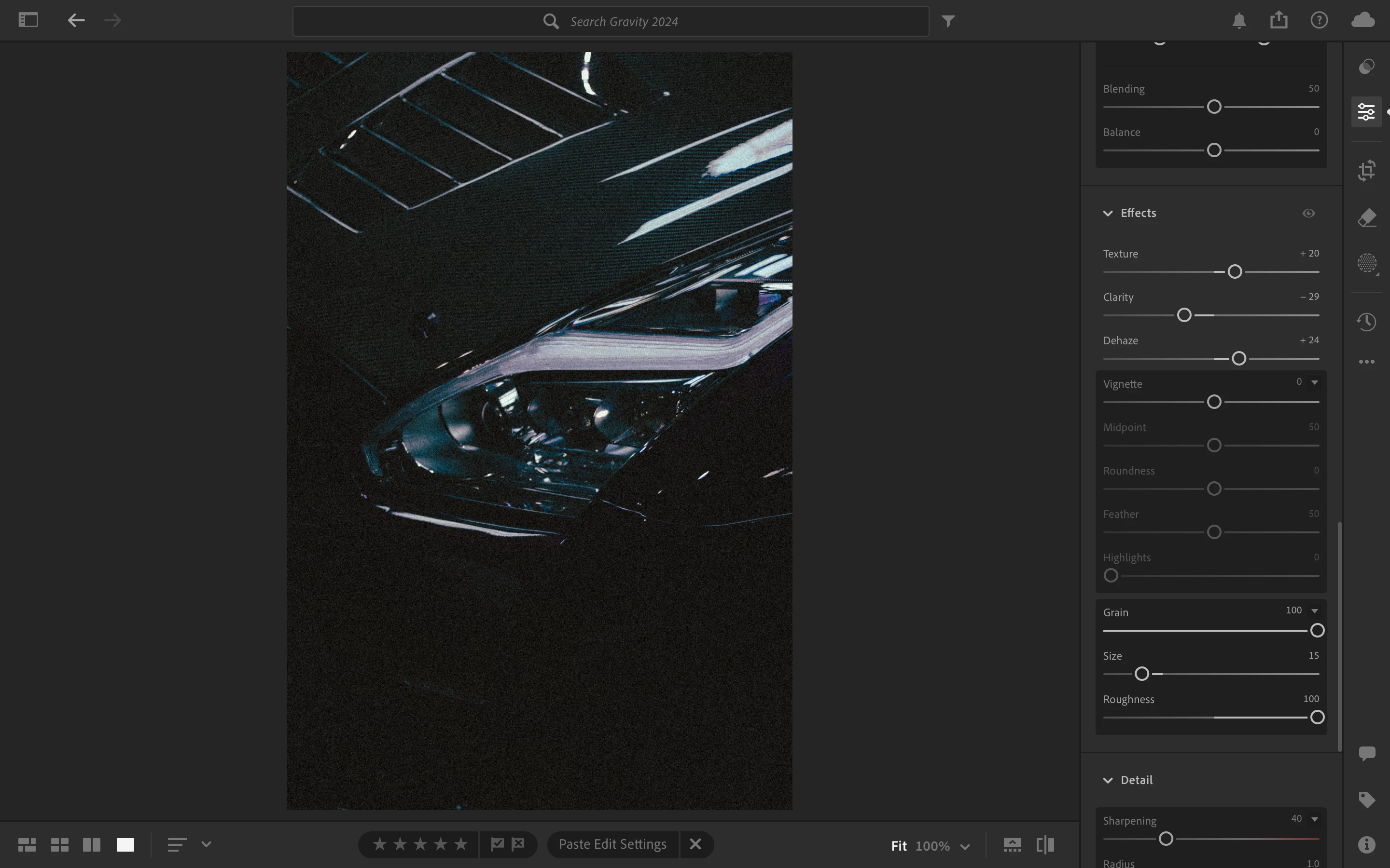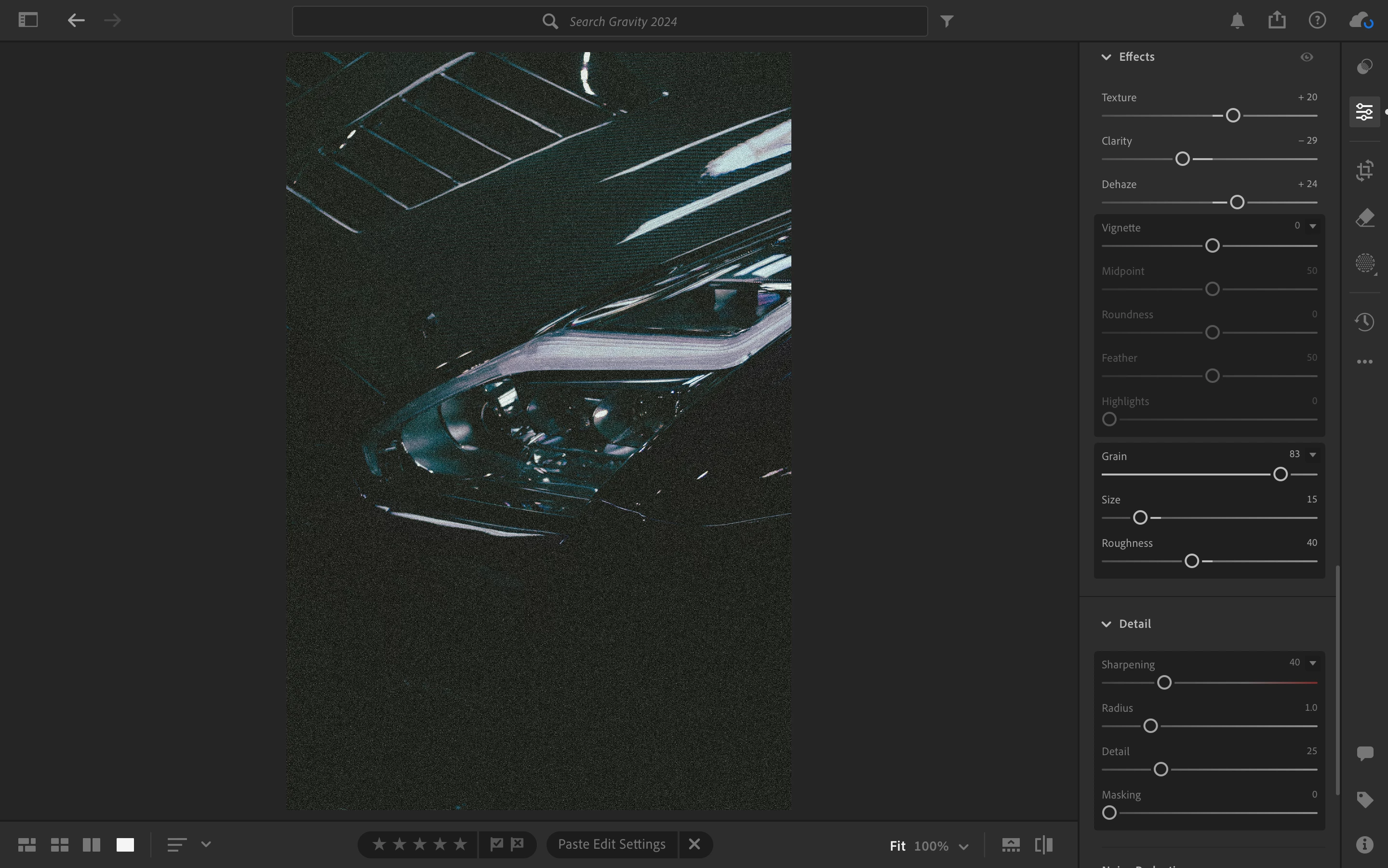 I'm looking to add more noise onto my image than what seems to be currently possible, except when I paste adjustments from a previous image (shown below)