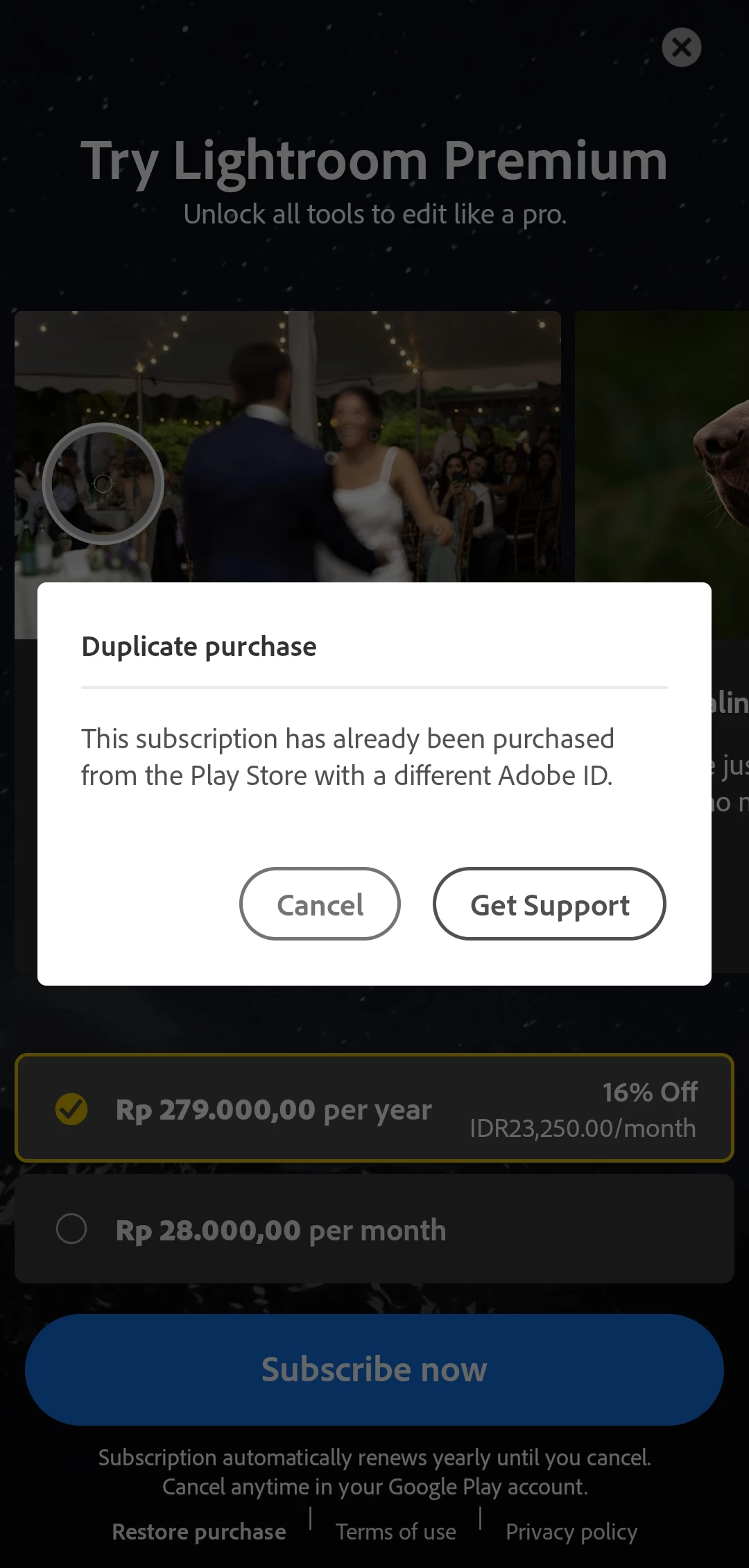 - I just subscribed to the Lightroom Mobile Android app premium plan on March 2nd. It was working well for 24 hours, then suddenly when I opened the app, it was the basic plan, not the premium anymore. When I click on Subscribe Now to check, it says "This subscription has already been purchased from the Play Store, with a different Adobe ID" Please note that I have only one email address, my Gmail address. I asked help to Adobe support, unfortunately useless. Can anyone help me?