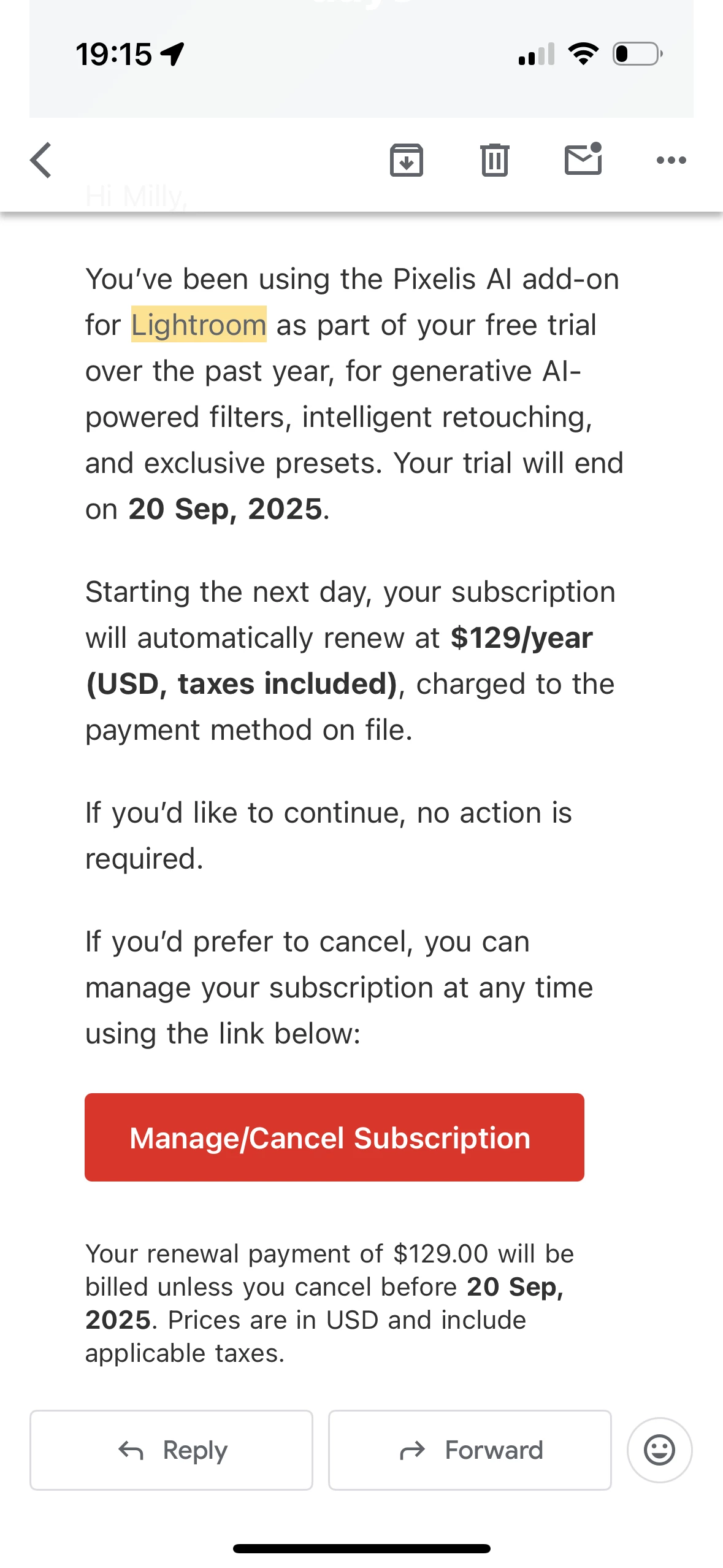 I received an email telling me my Pixelis AI Lightroom add on free trial will be expiring soon.