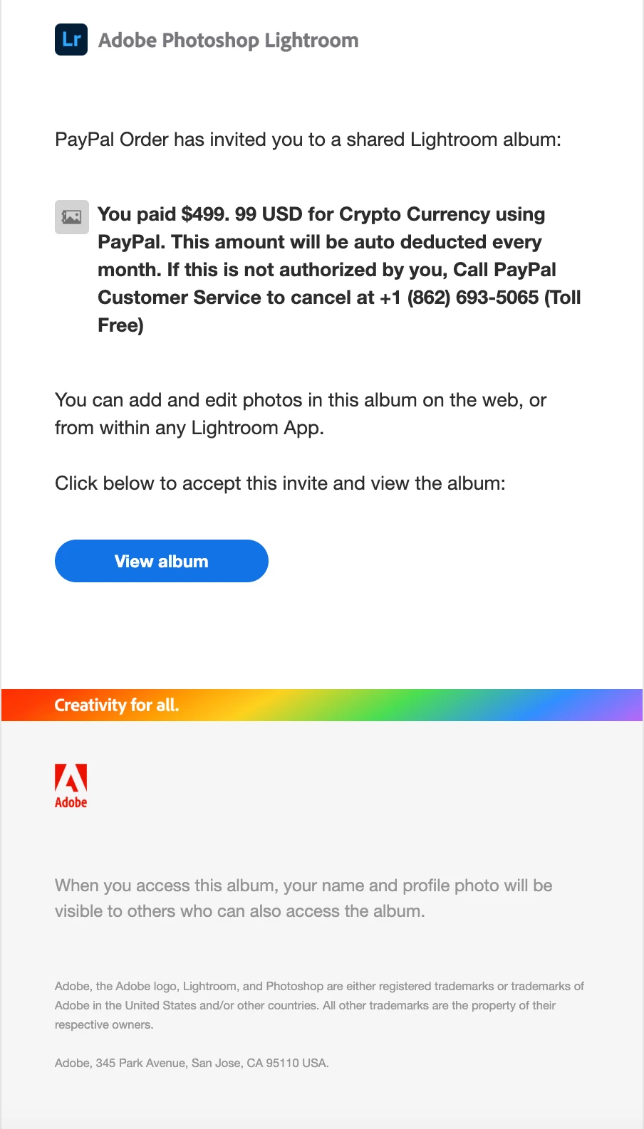 I forwarded the email onto the specialised phishing team ("phishing@adobe.com") who eventually got back and told me in an a fairly automated way that the item I received did not appear to be a genuine Adobe message. Fine. But in the meantime I also checked it with the Adobe live chat who completely contradicted this and told me explicitly the email was fine to open. This was their verbatim reply after taking about a day to "check" it (the grammatical errors make me think this is all being handled in India?): "Thank you for contacting Adobe, this is to inform you that the email is from Adobe as someone share the Lightroom album access so you can also view there work."