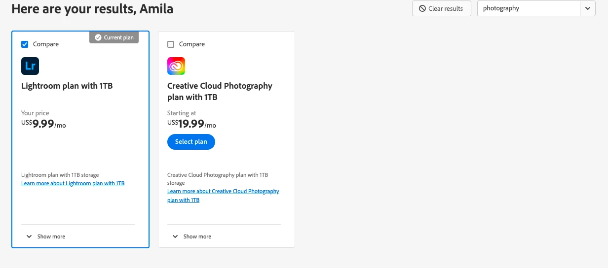 I currently use Lightroom CC plan with 1TB (one-year). I want to change my plant to Creative Cloud Photography plan (with 20GB of cloud storage) but that option is not listed in the list of availble plans. help.