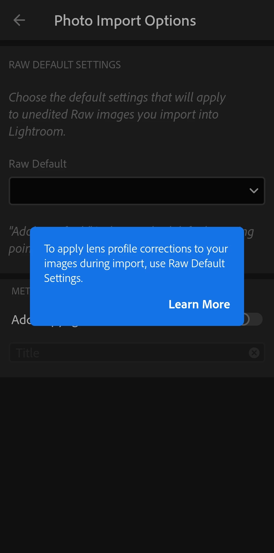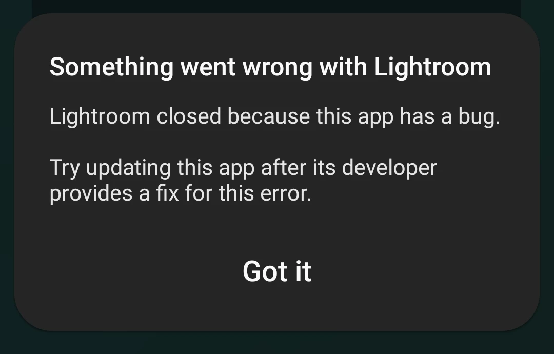 I have been using Adobe Lightroom for a while now, and I love it. However, I recently changed phones, and since then, whenever I open the app, the little blue circle on the cloud in the top right just goes around, and no photos appear in the gallery. I then found that the app apparently has a bug, because when I go to preferences > photo import options, the app closes and an alert shows saying the app has a bug, please update the app when the developer has fixed the bug.