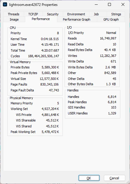 LIghtroom is in "Sync pending", eats CPU, does IO, and never finishes.