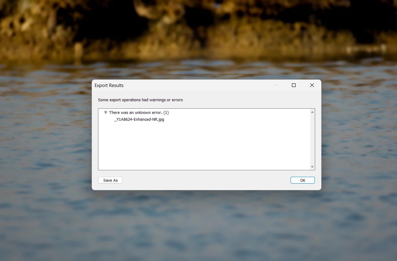 When I try to export the raw photo I edited, I get this error. When I save it as a DNG, it exports the photo in a smaller size. The actions I performed include object and background masks, as well as denoise AI.