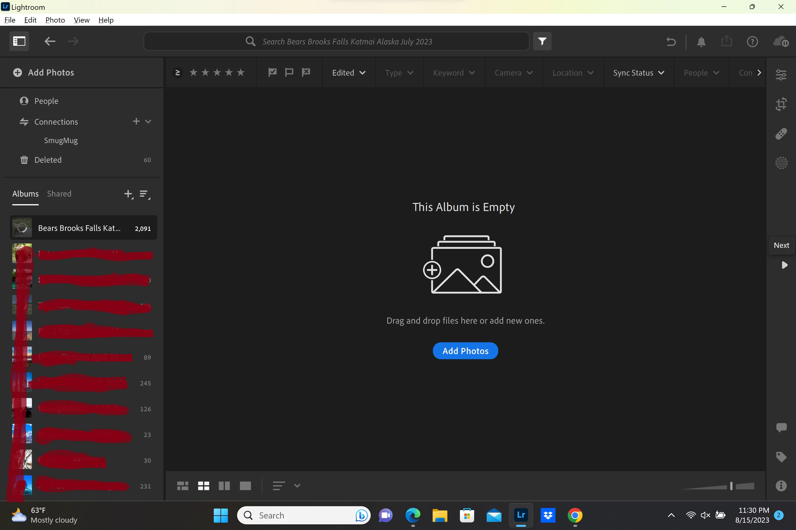 I use Lightroom on my PC with Windows 11, and I use the cloud. I was editing photos in an album, when the photos disappeared and "This Album Is Empty" appeared. On the left hand side I can see the album and it's showing 2,091 photos in it, yet I cannot access the photos. I do not have any filters selected. I tried running a CC update, but it didn't resolve the issue. I've also shut down and restarted my PC. Below is a screenshot of my LR screen and below that is a copy of the installed version number of my software.