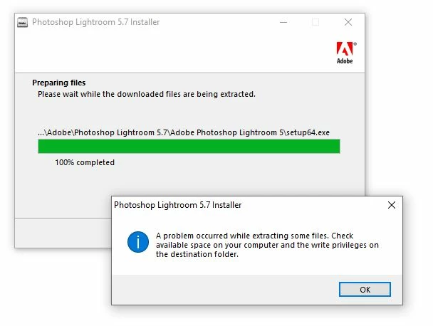 I was using Lightroom 5.7 on a Windows 7 computer. I now have a Windows 10 computer and am trying to install Lightroom 5.7 but am running into problems. It says I am running out of space which,