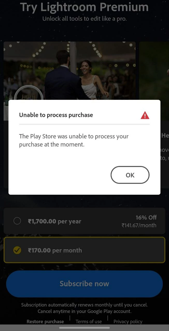 I have paid for lightroom mobile yesterday on Play Store but on the app it's written Unable to complete purchase, i tried on my tablet too but same problem.