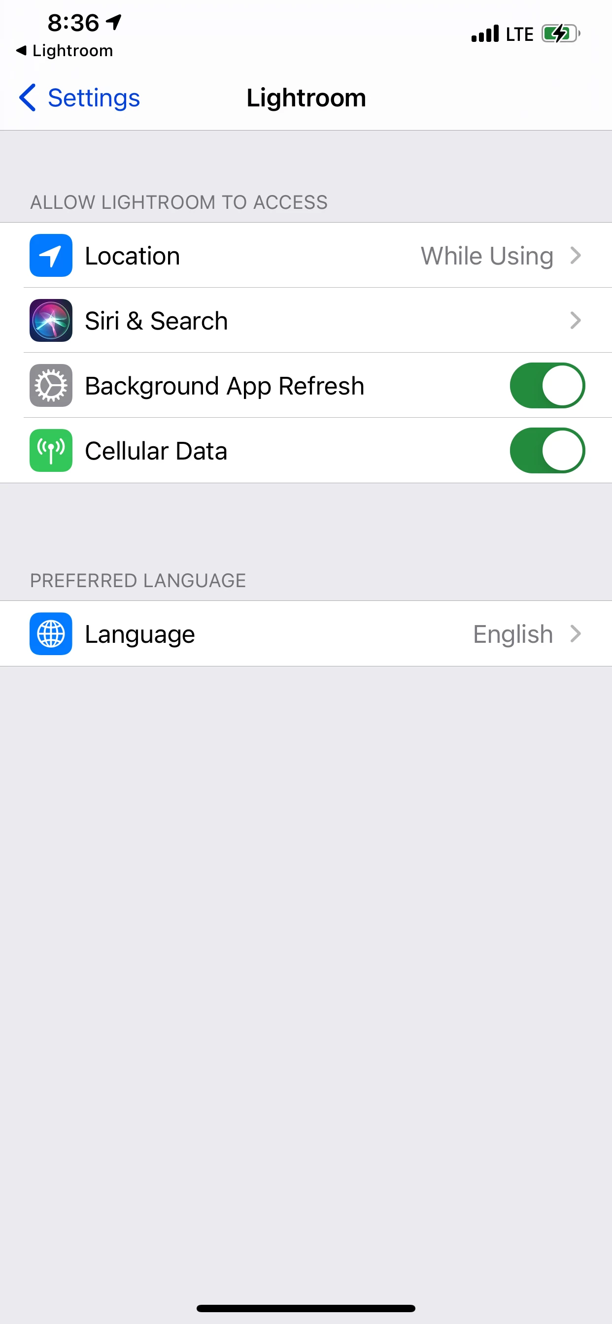 When I go into the settings for Lightroom there is no option to give access: need help? It was just working yesterday!