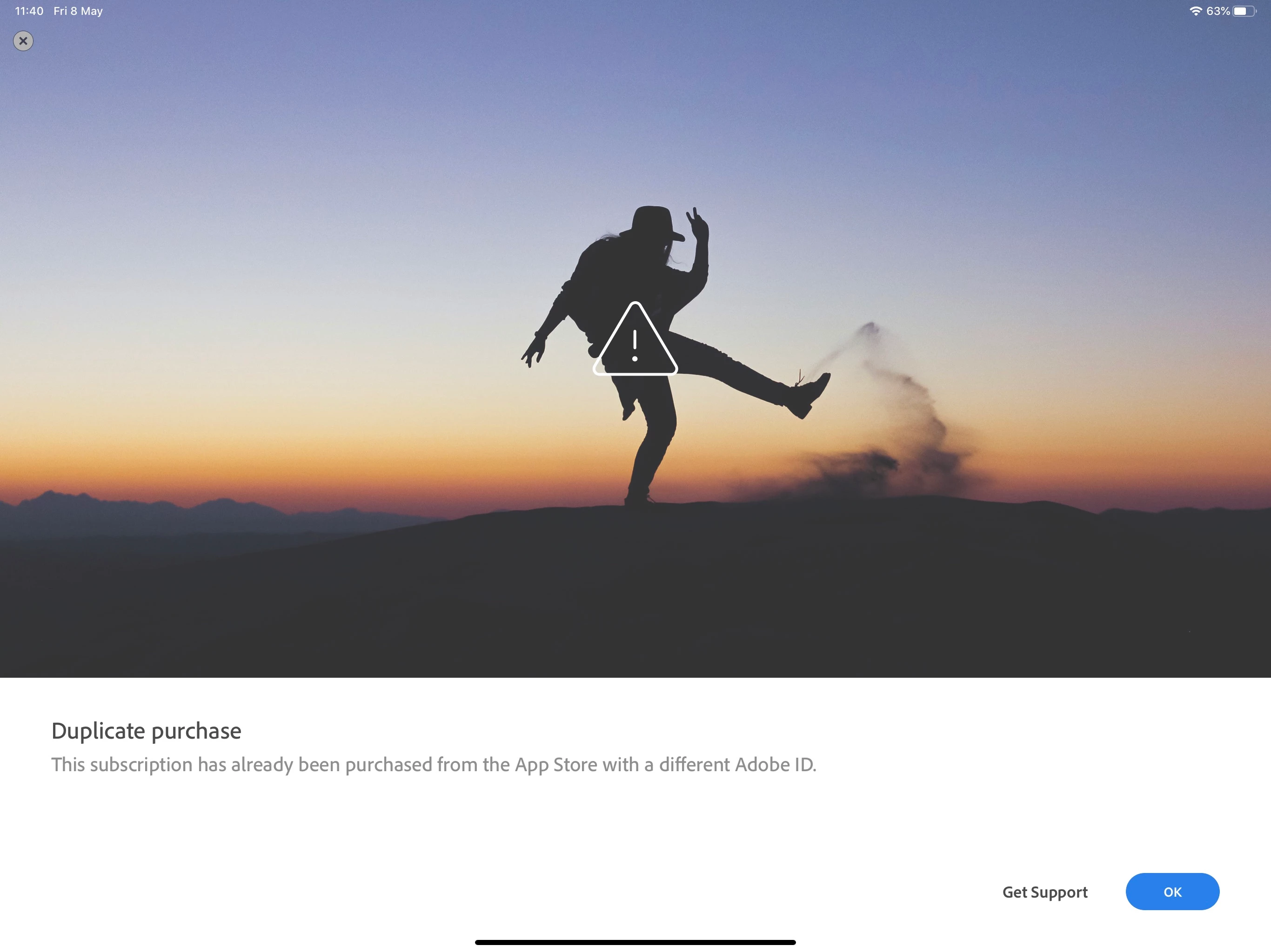 I have an ongoing subscription for light room on the iPad. I haven't used the app in a while. When I login I don't have any premium features and it won't let me restore them. It says I have "Duplicate Purchase - The subscription has already been purchased by the App Store with a different Adobe ID". I have always had the same Apple ID and email so this is definitely an error.