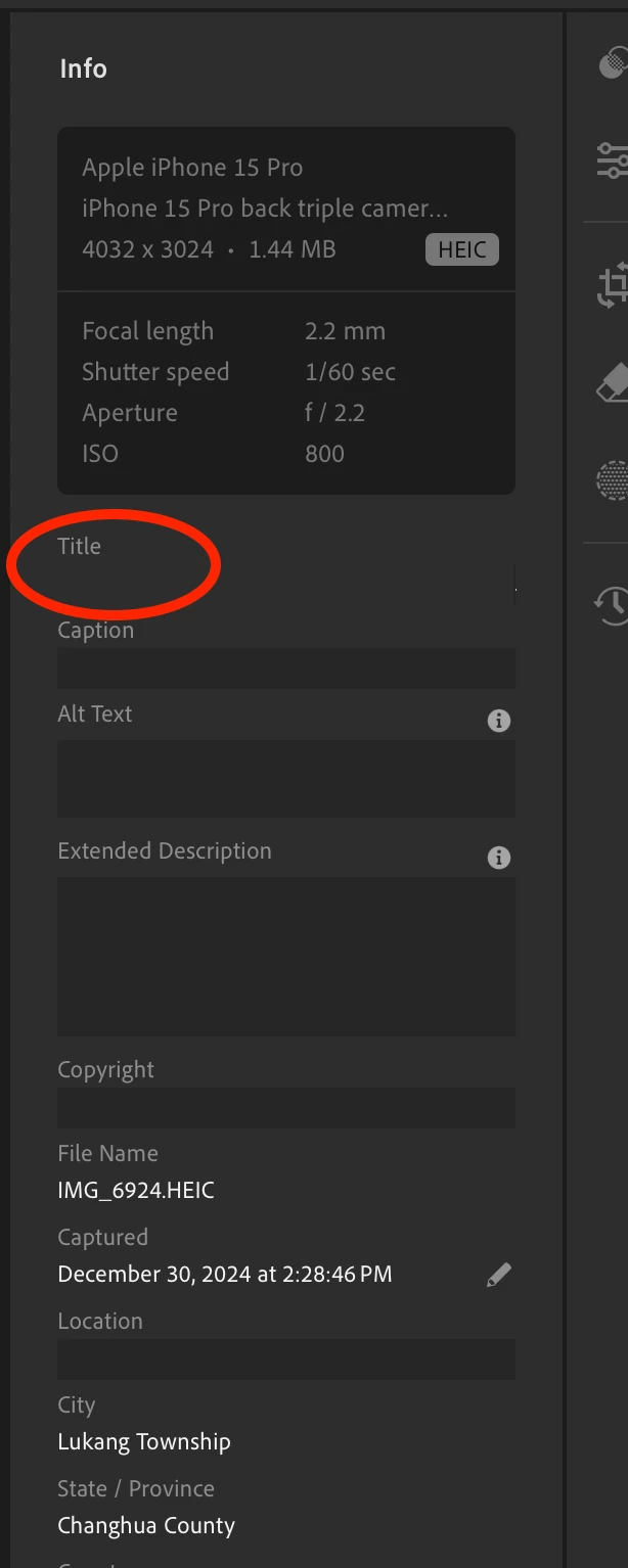 - The Title field becomes grayed out and stays that way, even after clicking off the selection. It remains disabled until quitting and restarting Lightroom.