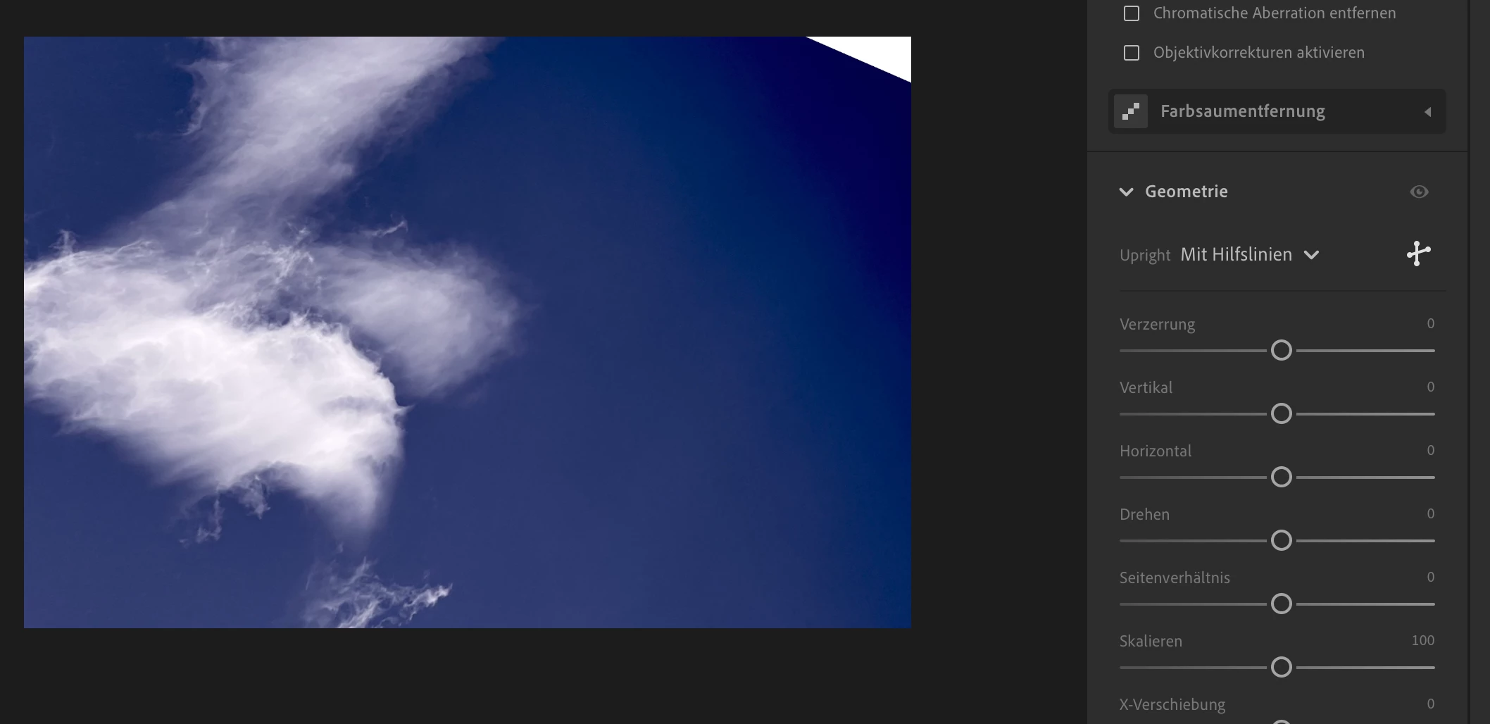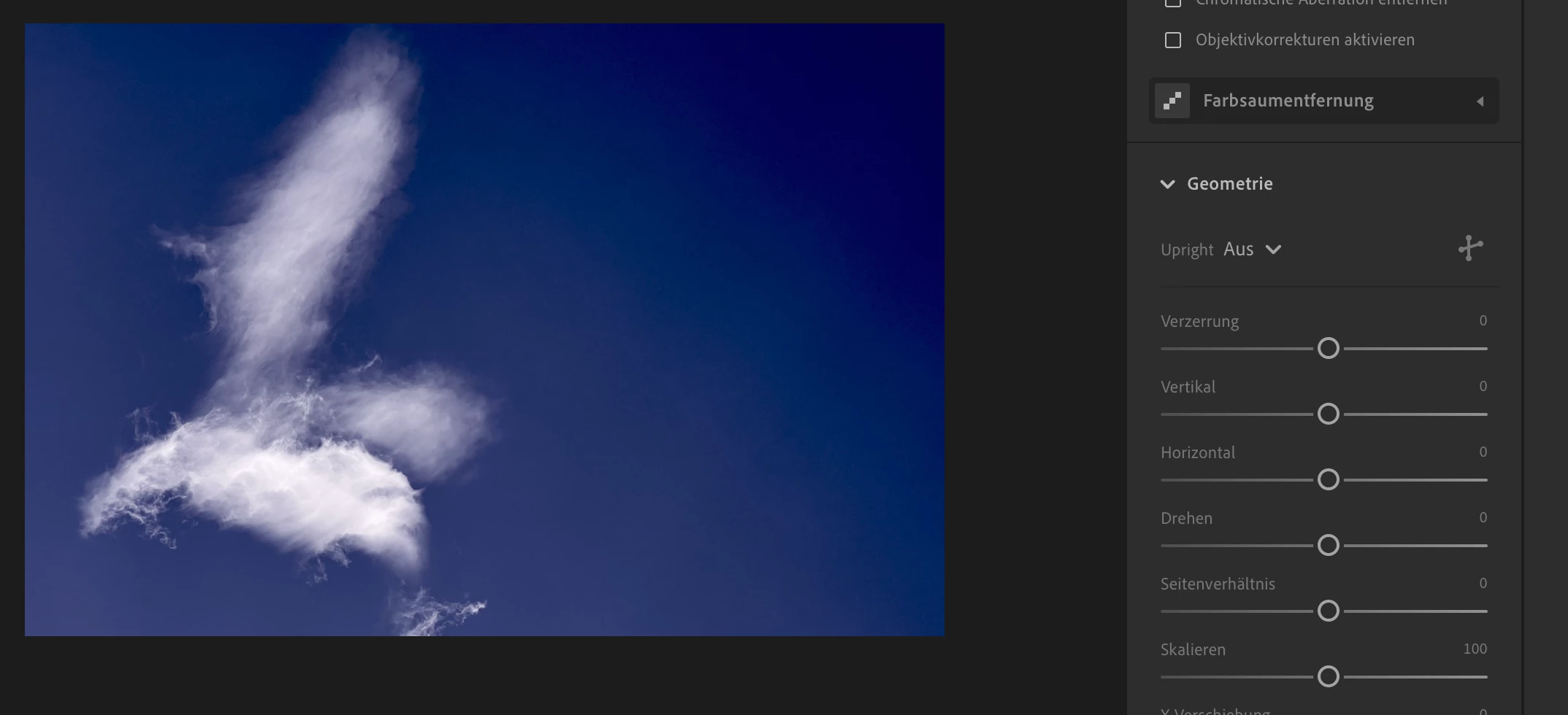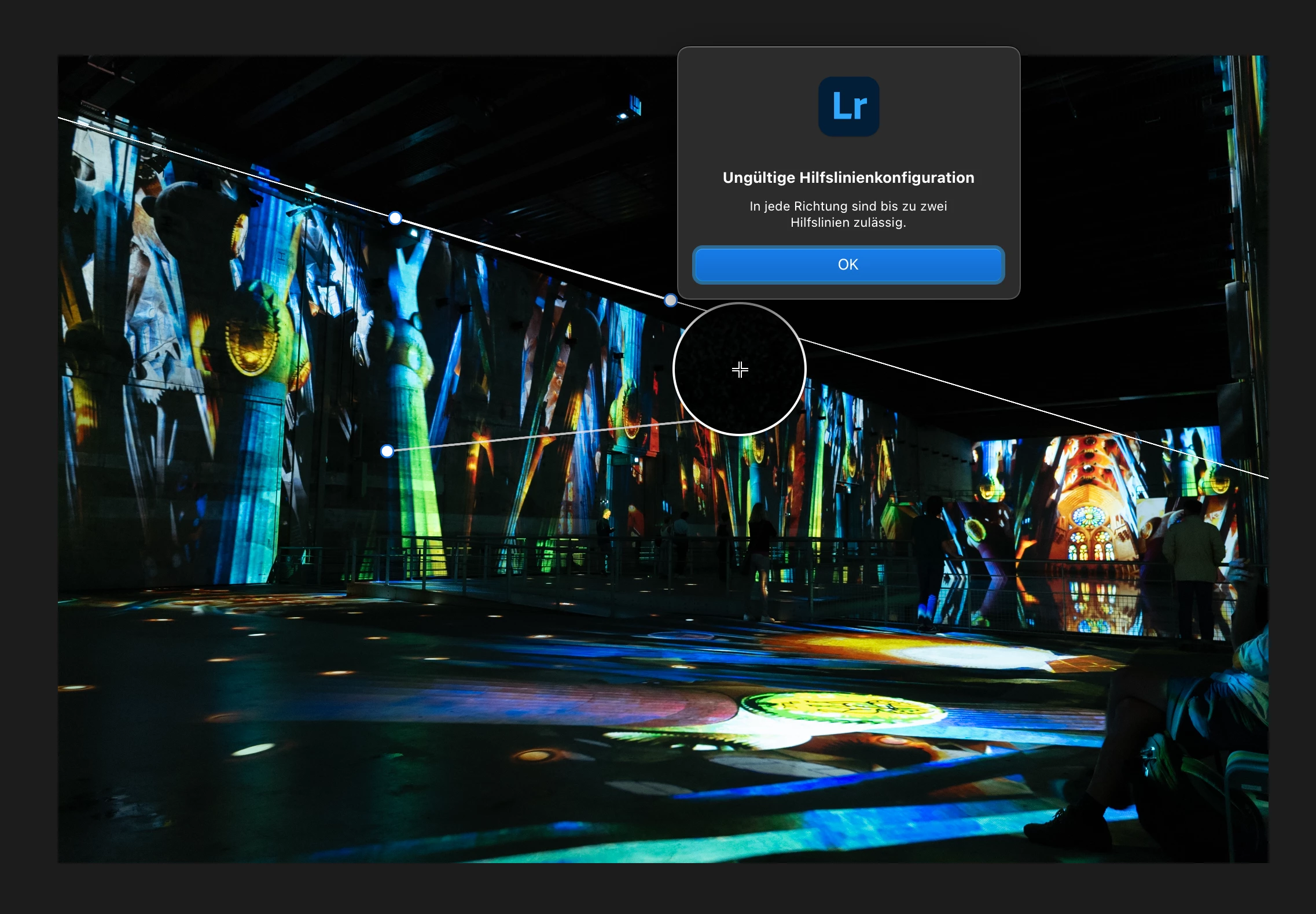 Zum Fehler: Werden Linien im Bild gezeichnet, erfolgt direkt nach der zweiten Linie eine Neuberechung des Bildes. Dies ist das "normale" Verhalten. Bei Bildern (in der Regel aus der SL2) kann ich Hilfslinien ziehen aber eine Anpassung des Bildes erfolgt nicht. Es erscheint auch gelegentlich die Fehlermeldung, dass zu viele Hilfslinien gezogen wurden (tritt teils auch schon bei einer (!) Linie auf). Manchmal werden bei der Aktivierung der Funktion vier vorgegebene Linen an den Rändern des Bildes "automatisch" vorgegeben ... nach dem Löschen der Linien und "eigenen" gezeichneten Linien funktioniert Upright weiterhin nicht. Reset Upright hilft leider nicht. (Es treten auch teilweise andere Probleme auf: z. B. Bild wir korrigiert OHNE eine Hilfslinie und erst nach "ein paar mal hin und her klicken" verschwindet dies ...)