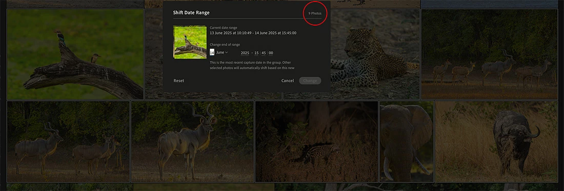 "1 photo" shown in upper right and clicking change will only change that photos time, intead of all photos