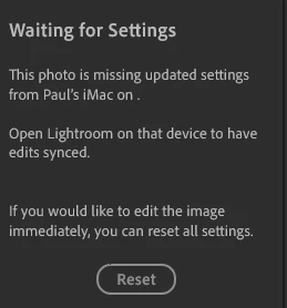 My Lightroom on my iMac (fully updated) is giving me this message for several, but not all, photos and reverts these photos back to their original (on Lightroom).  On my iPhone and on the web version I get that message but the edits have survived.  However, I am unable to edit these further on the iMac without resetting to original.  I did this several times and re-edited them and get the same message and seem to lose the edits (on Lightroom).