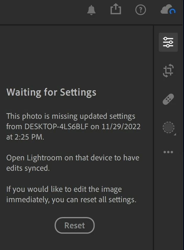Some photos show "Waiting for settings" notification and say if you want to edit them now hit the "reset" button. I fixed or updated all programs and it worked on a couple of photos yesterday and now back to not working at all. My photos are stuck in limbo and I cannot edit, download or move anywhere.
