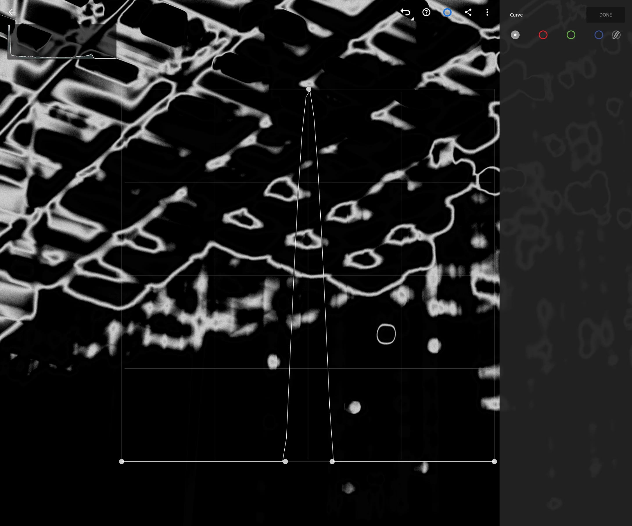To my understanding, this should (approximately) render a point near 50% luminosity as pure white and everything else as pure black (with a steep curve on both sides). And it appears to have done so. I only do this to make it obvious what the tone curve seems to think 50% is.