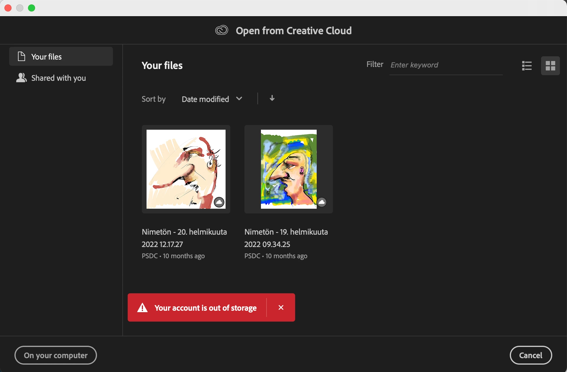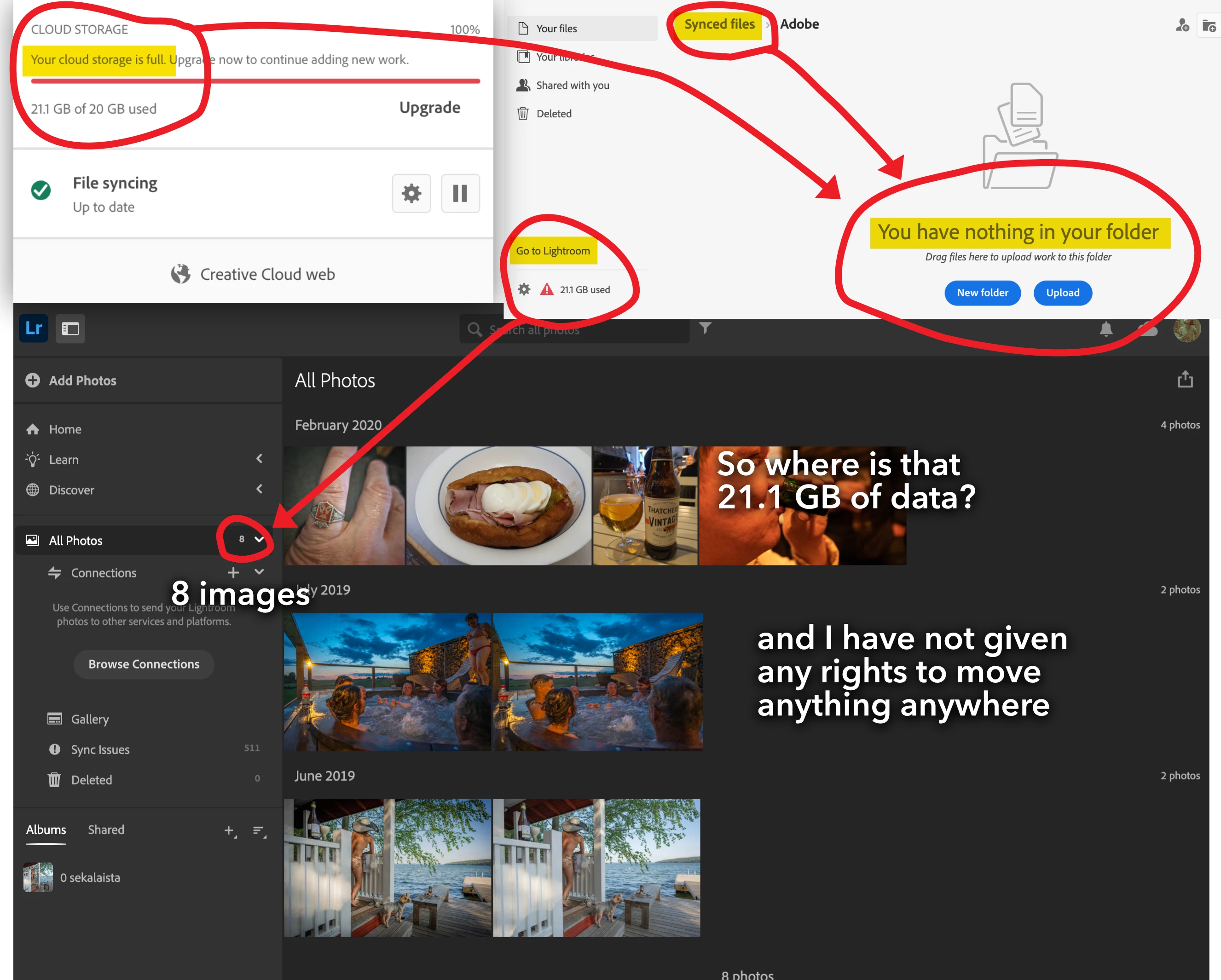 My CC says that on MBP that "Your cloud storage is full". I haven't give any permisson etc. to move any file to any cloud, but somewhere is 21,1GB data. I tried to find those, but only found 8 image in LR somewhere... so?