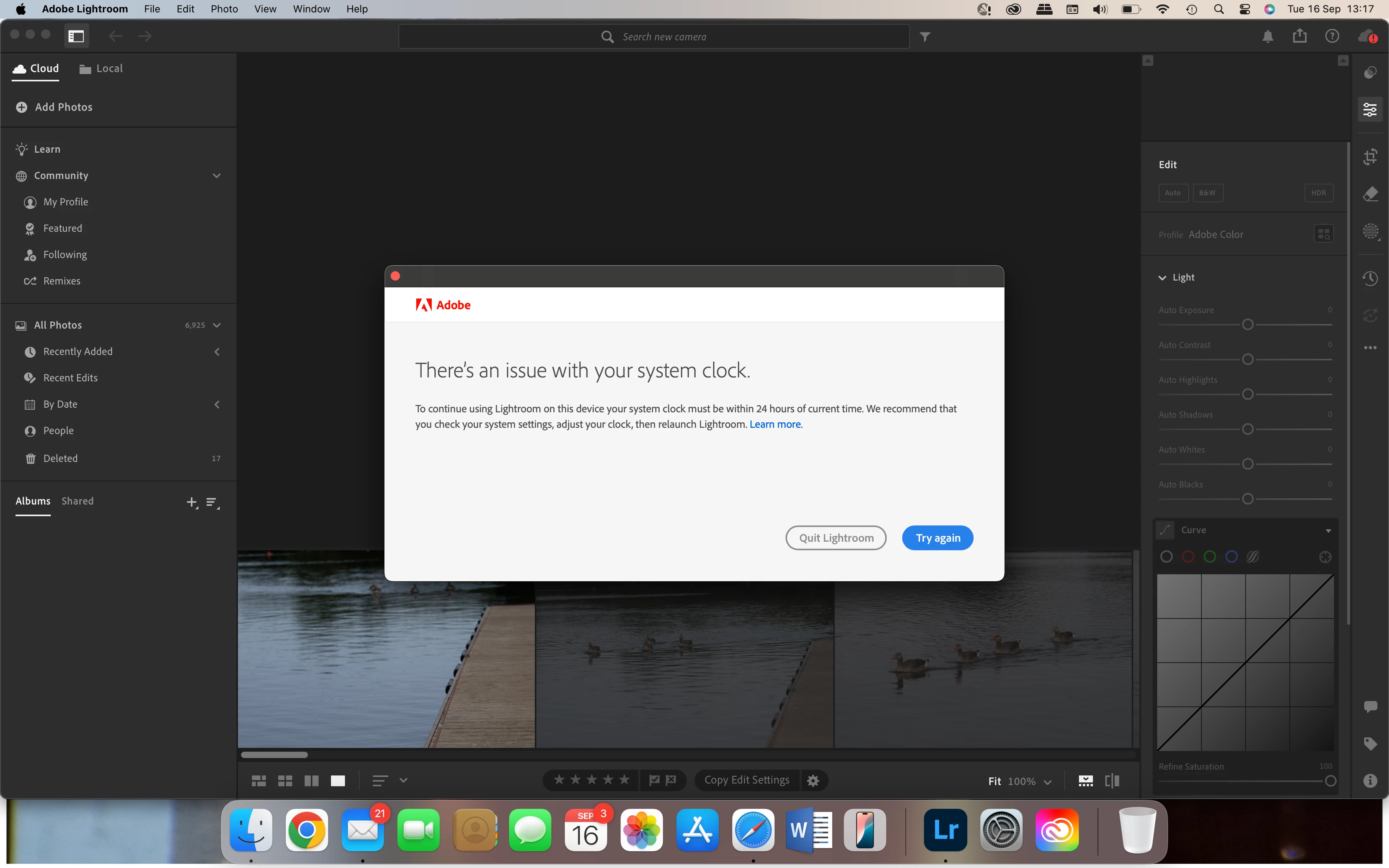 Why does Lightroom there’s an issue with the system clock.