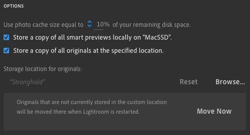 I've set Lightroom backup my photos to a local drive named "Stronghold" in addition to being saved in the cloud. I usually import my photos into Lightroom on my laptop and then plug in my hard drive (Stronghold) every few weeks to transfer all of the photos (as the first picture shows).