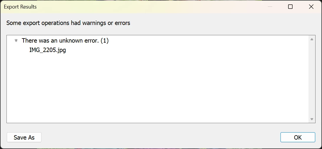 I edit in LightroomCC with masks and then when I try to save or export my image, (jpeg because I accidently shot only in jpeg) and choose the folder, it then acts like it's going to save it, but then at the end it says "There was an unknown Error (1)".