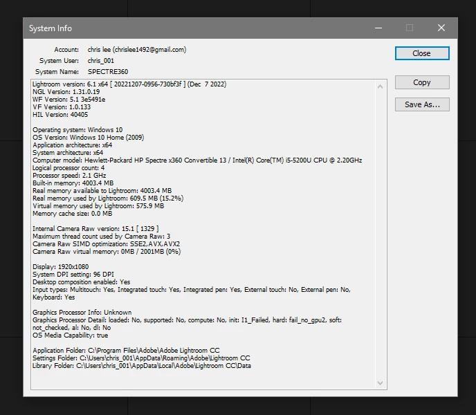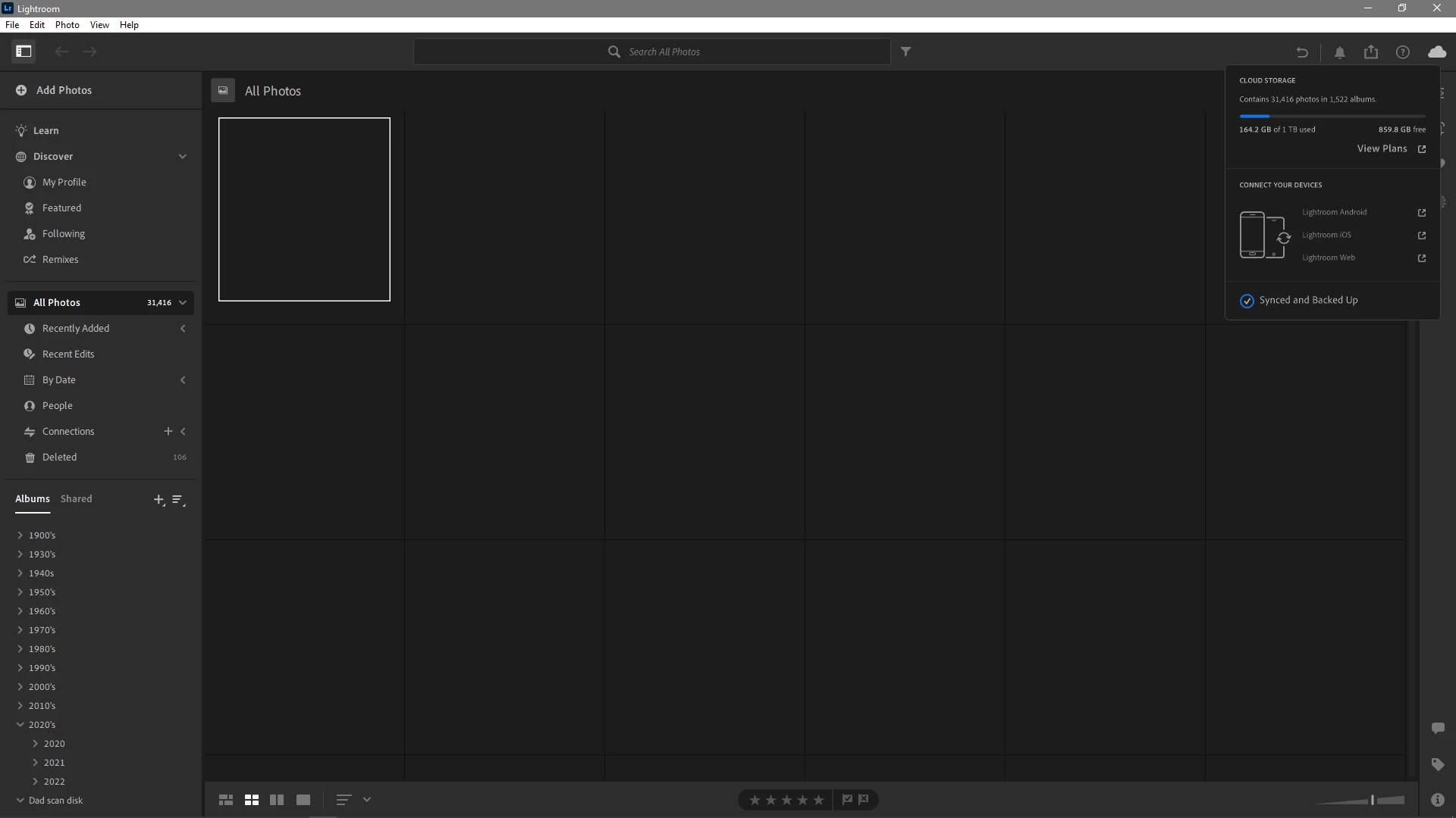 Windows 10, lightroom ver 6.1 stuck, synced and backed up but no photos