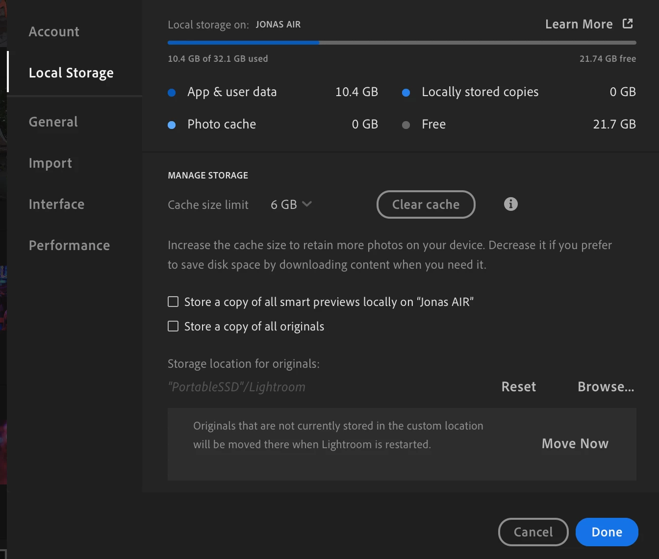 I am having trouble with Lightroom using too much space on my macs internal drive. I am using Lightroom and sometimes Lightroom Classic.