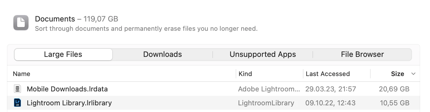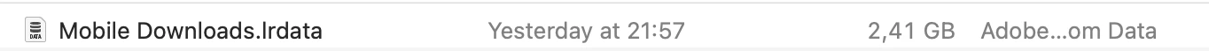 2) According to my Macs storage count "Mobile Downloads" is taking up >20 GB on my internal drive and "Lightroom Library" is taking up 10,55 GB. In the Macs Finder however these files are way smaller... (See following 3 screenshots).