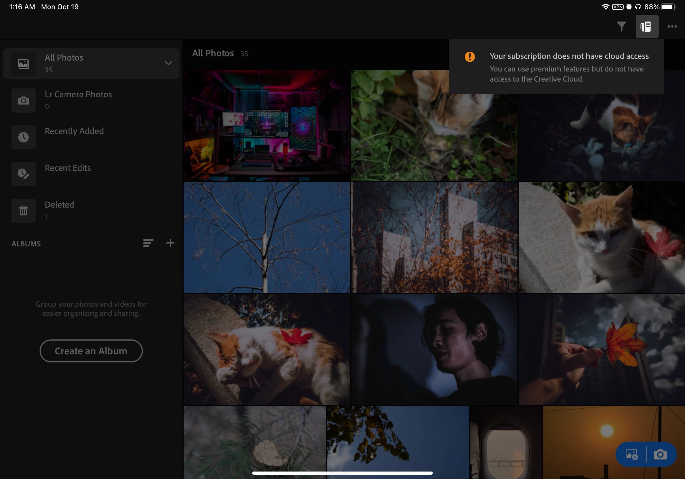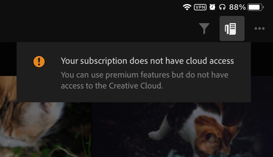 Dunno why my Lightroom on my iPad Pro just became like this today, the four button on the top left just gone and it said my subscription does not have cloud access. Have anyone came across this situation before? I would be of great appreciation if you can help me.