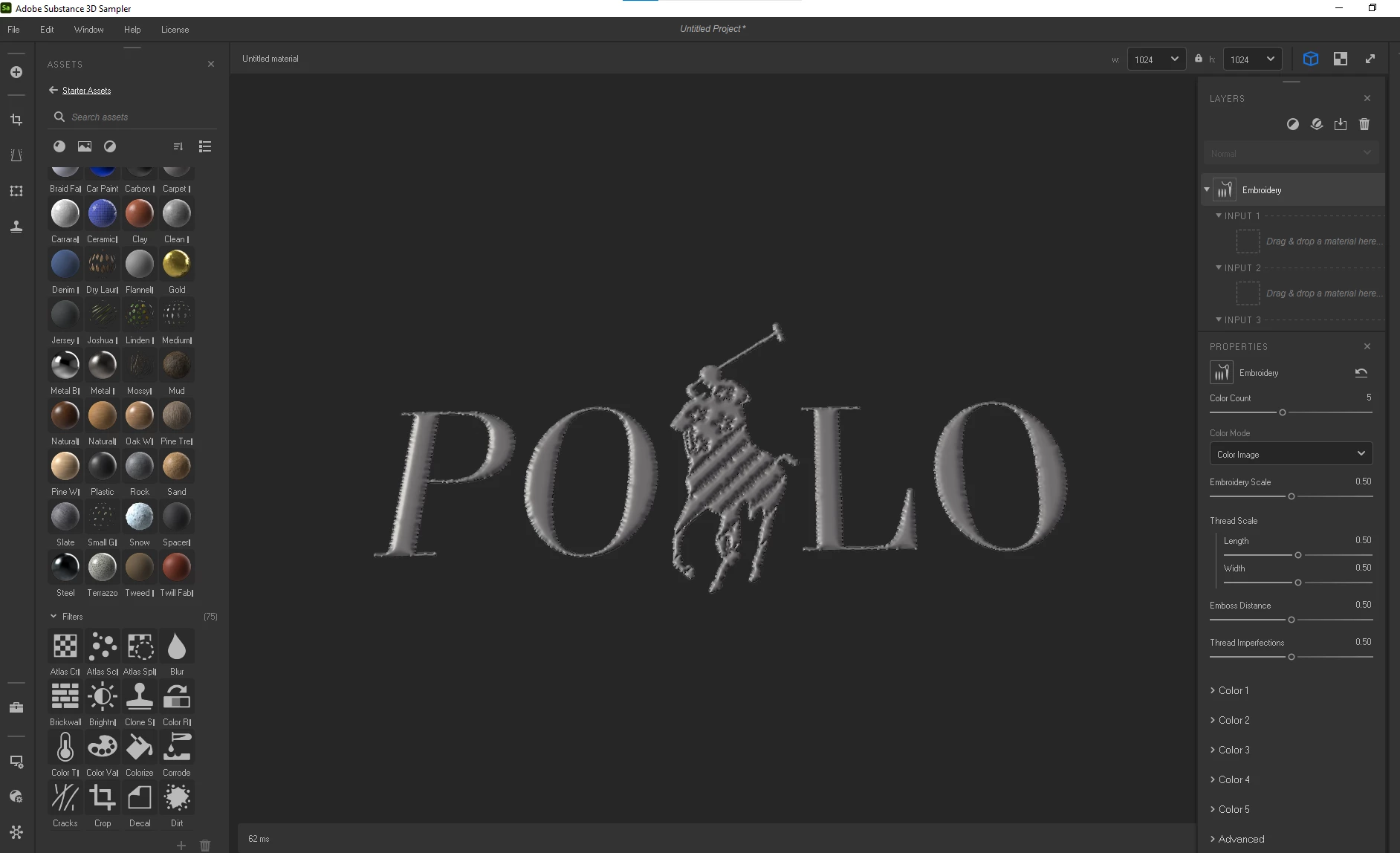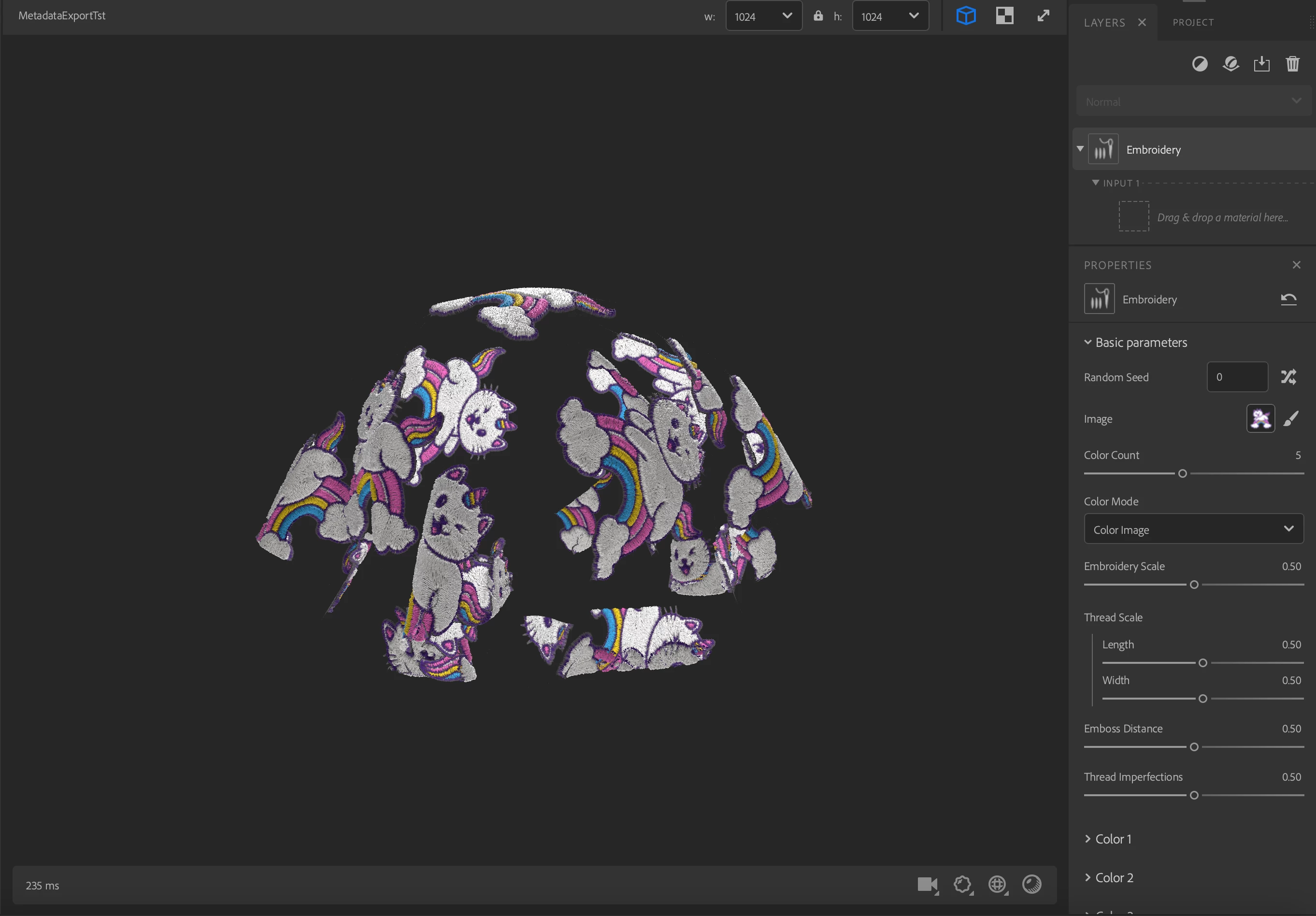 The file was added as an image to bitmap, with a base material in the layer. When I add the embroidery layer, the image shows up, but as a grey shape. The threads or the color is not showing up.