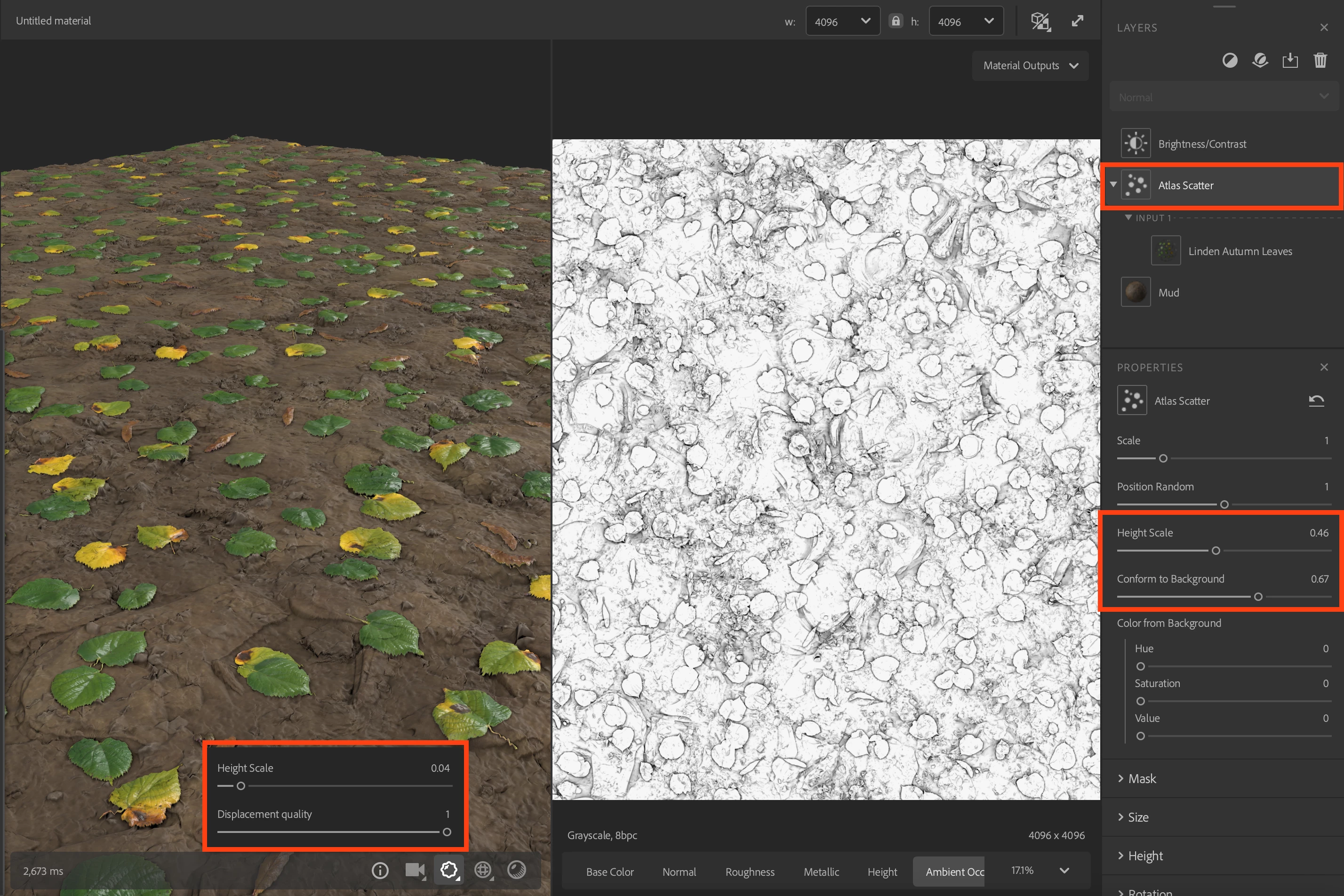 Then you have to tweak not only the "Height Scale" and "Diplacement quality", but also tweak the displacment values in the "Atlas Scatter" filter: