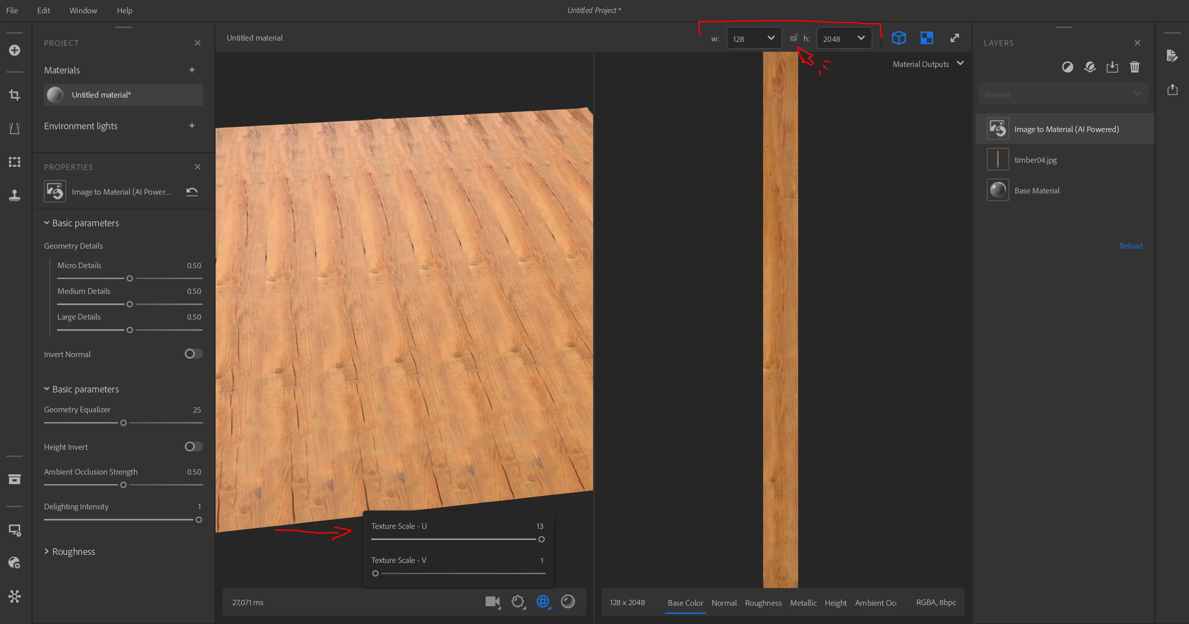 I have a photo of a wood beam. 2163px H x 142px W. I want to generate normal map form it. When I bring it into 3D sampler regardless of choosing which "Image Creation Template" I use, the output results are alway a square image. IOW the normal map that is auto generated is a square and I need it to be 2163px x 142px to match my diffuse wood beam photo/texture map.