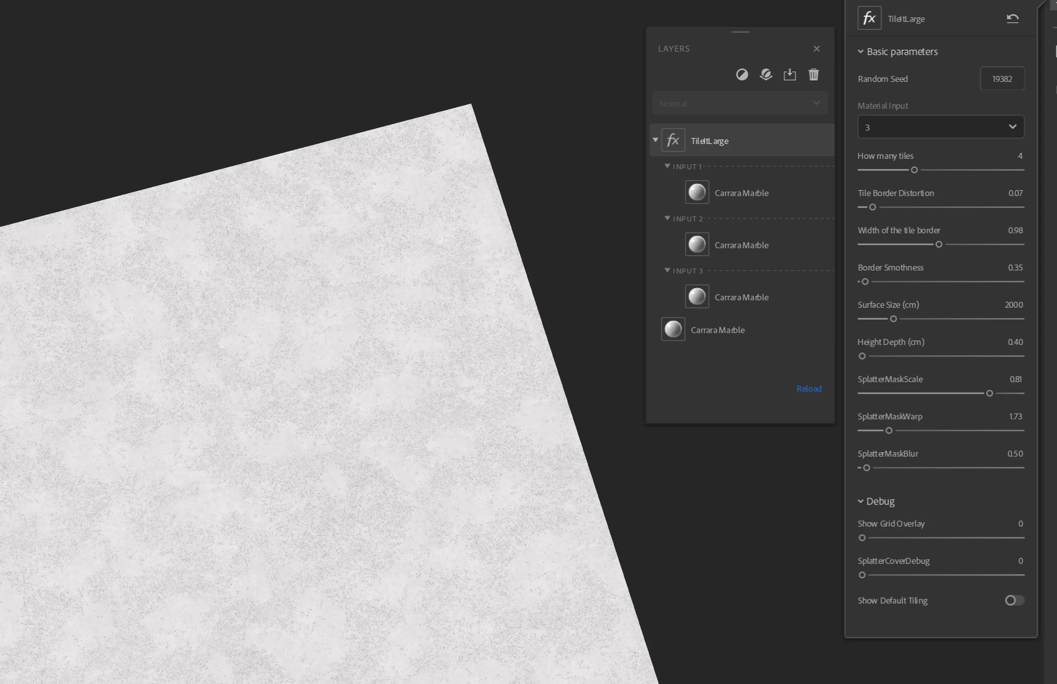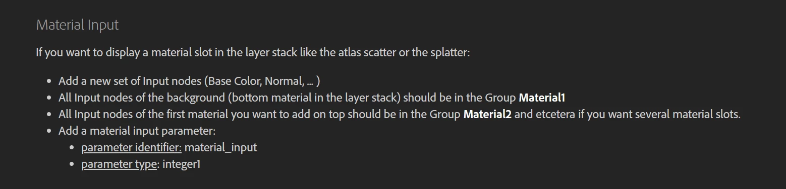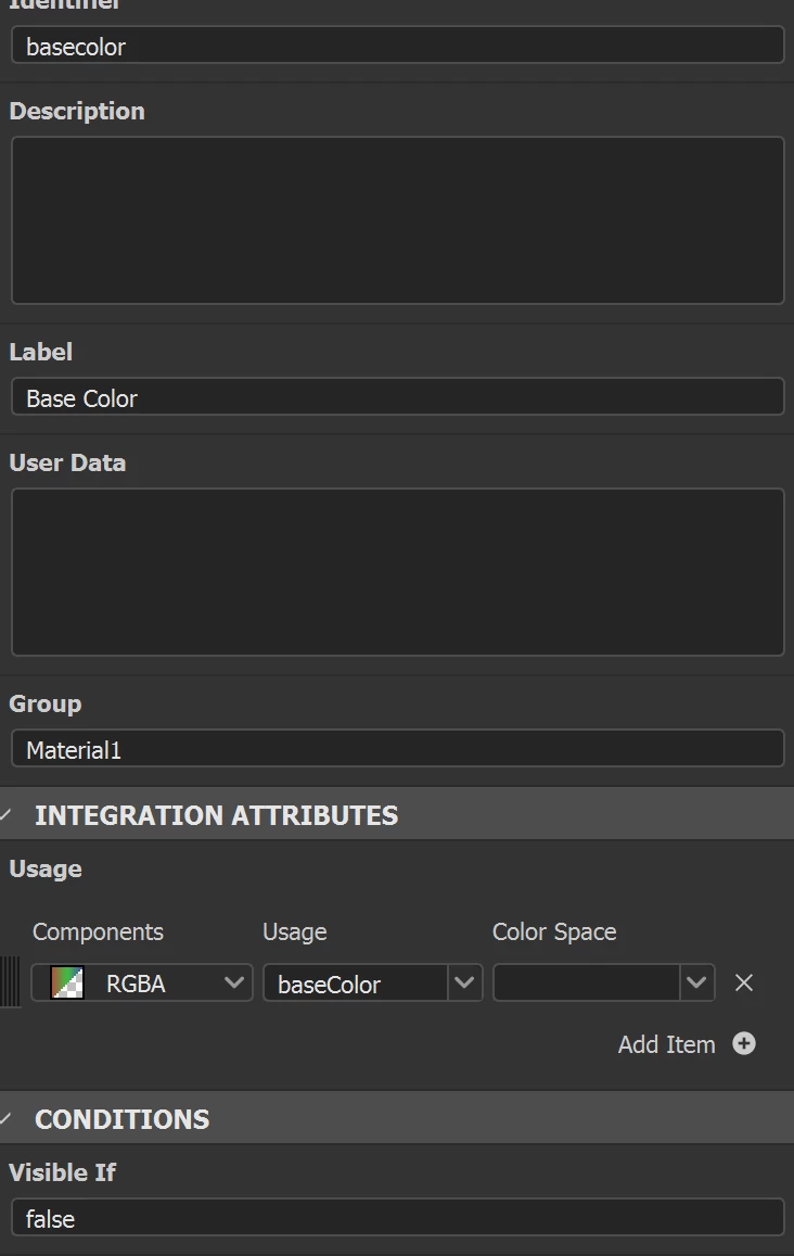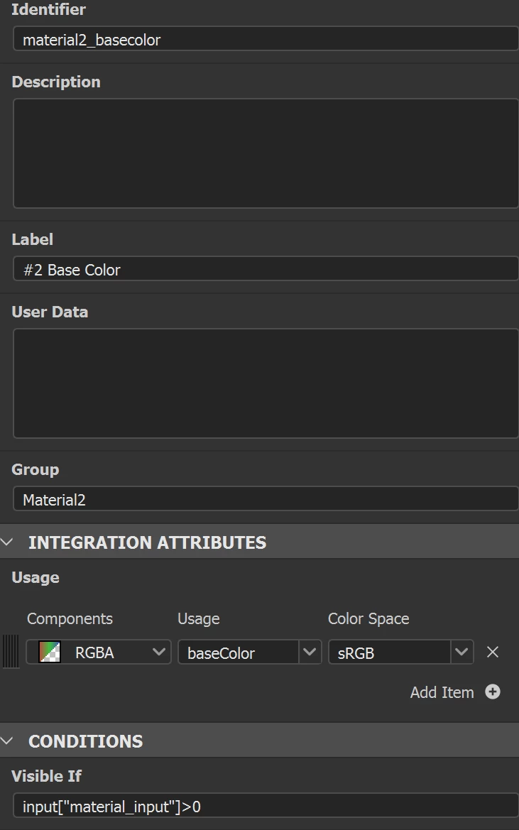 For Material1 group I explicitly set the visibility to false as a reminder because Material1 refers to the Material in the stack below the filter so that's where you put your base material then the filter on top. You can then reference that base material through all the custom inputs you have added.