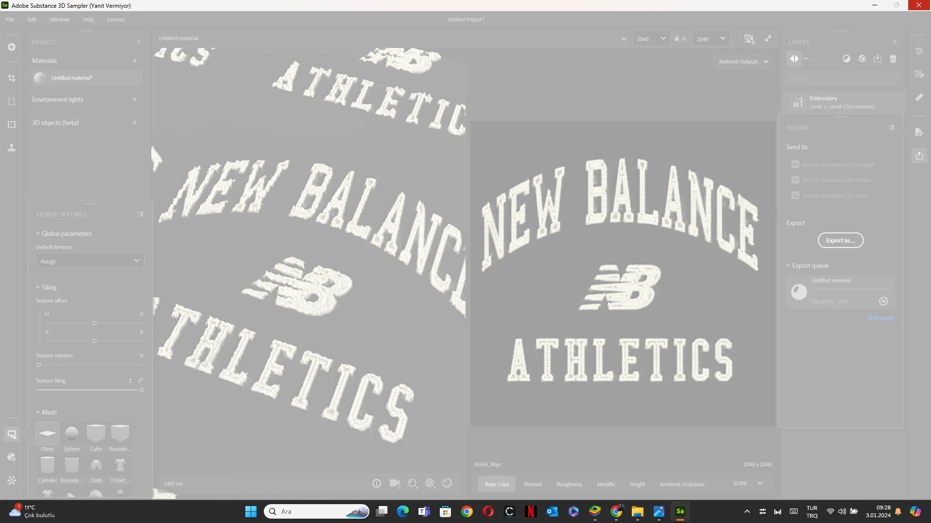 I'm using a Huawei D15 laptop, It has AMD RYZEN7 processor and 2 gb video ram, also 8gb ram. It's not so much amazing computer, but It's ok for my illustrations and jersey designs. I ran substance sampler 5-6 times and everytime I get a "not running" warning. Today I solve something about program, I created the stitch, It was ok for me, when I click export with standart settings, after 2 minutes, It's the result :((