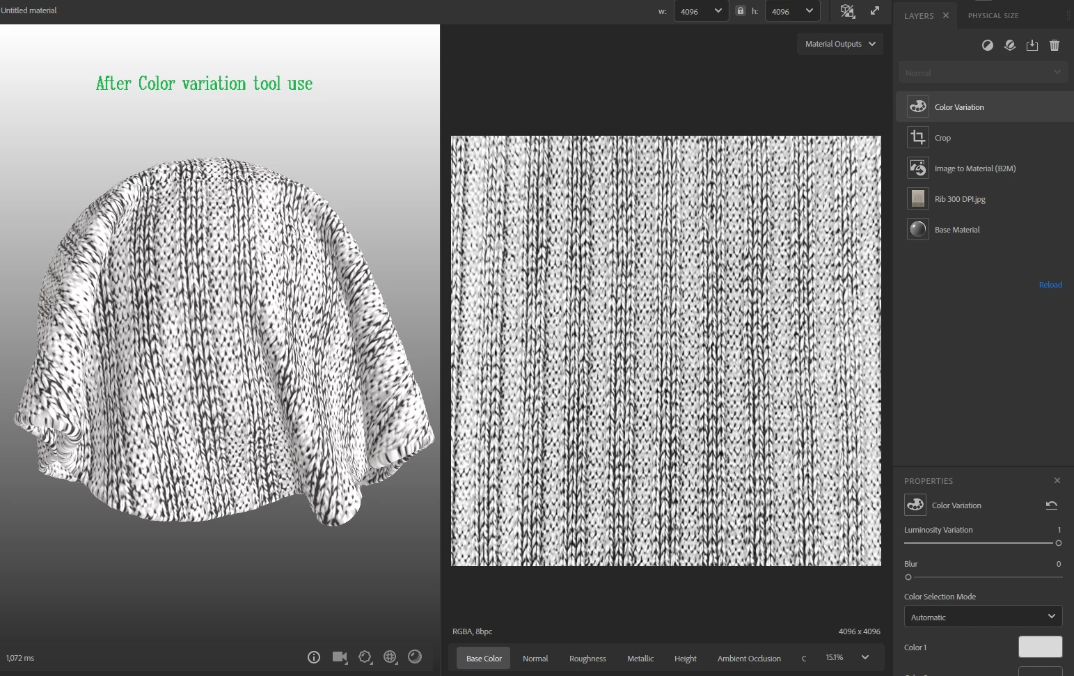 1. I want to re color the texture but once i do in sampler its pixlate and loss the deatails. any solution for the same (must need fabric details). I used COLOR VARIATION filter in layer stack top. (See ref image)