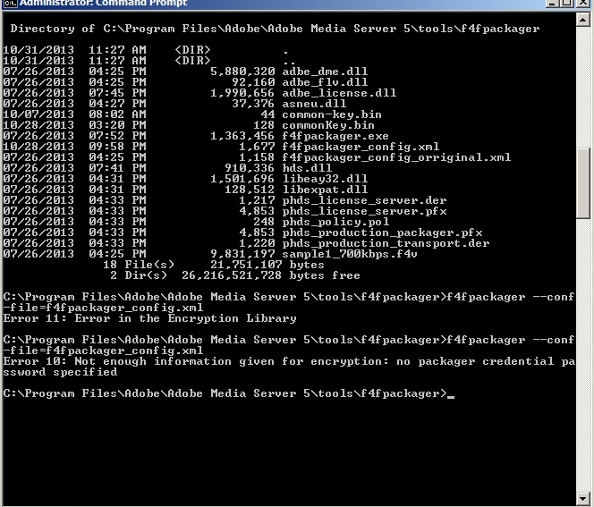 Below you can see the errors. We have copied the certificates and media to the f4fpackager to keep things simple.