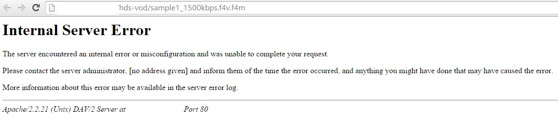 6. After PHDS configuration and restarting AMS, I tried to hit the same URL http://server-dns/hds-vod/sample1_1500kbps.f4v.f4m and expecting a new XML tag "drmAdditionalHeader" inside the manifest XML. But I got the error message as mentioned below