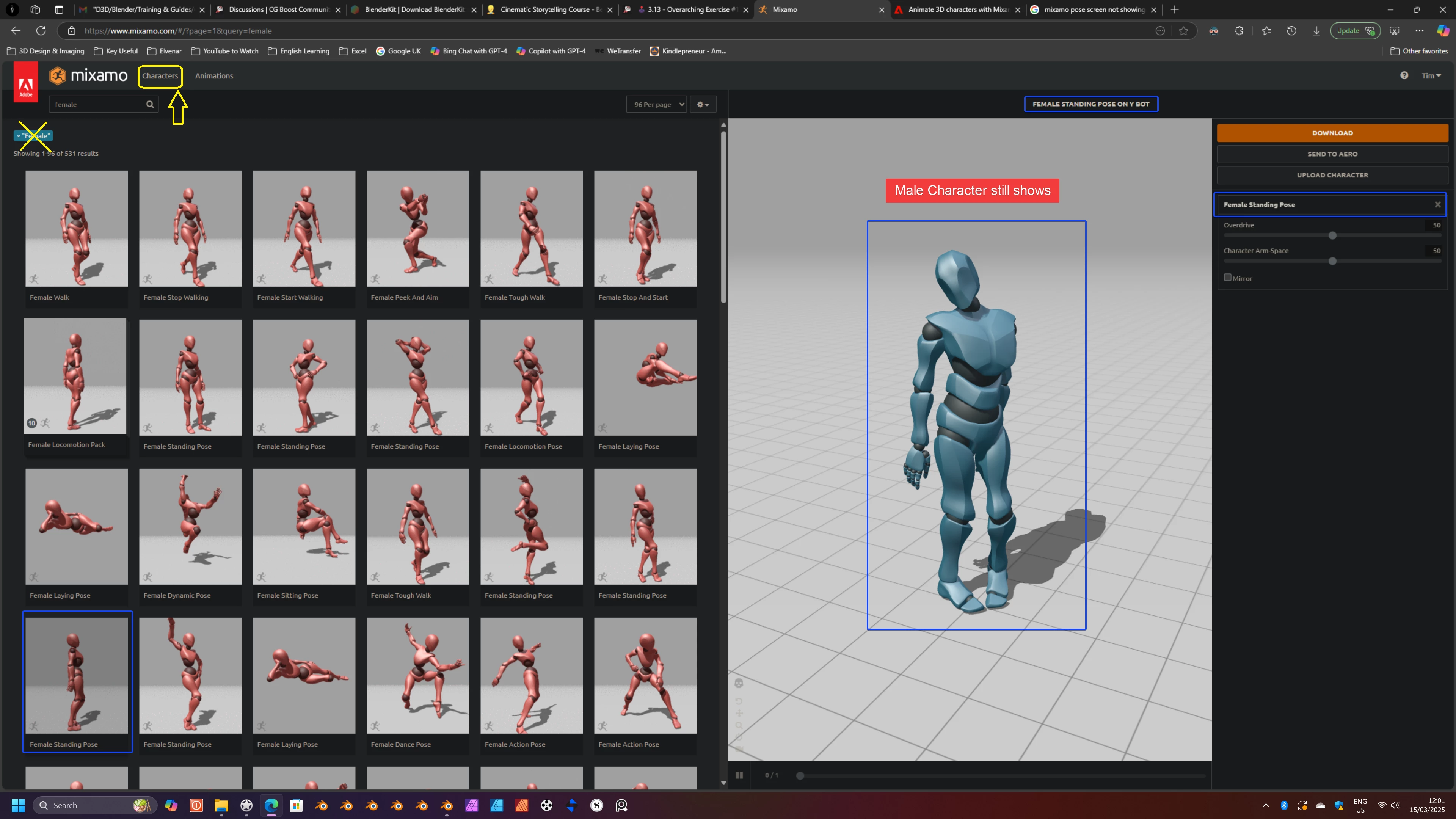 Irrespective of which character is selected, the pose window only shows the Male Bot and that is what's downloaded.