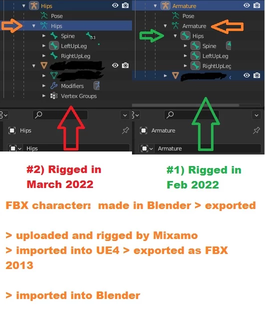- Here is the workflow of my FBX character: made in Blender > exported > uploaded and rigged by Mixamo > imported into UE4 > exported as FBX 2013 > imported into Blender again to add bones > uploaded to Mixamo to get a new animation...