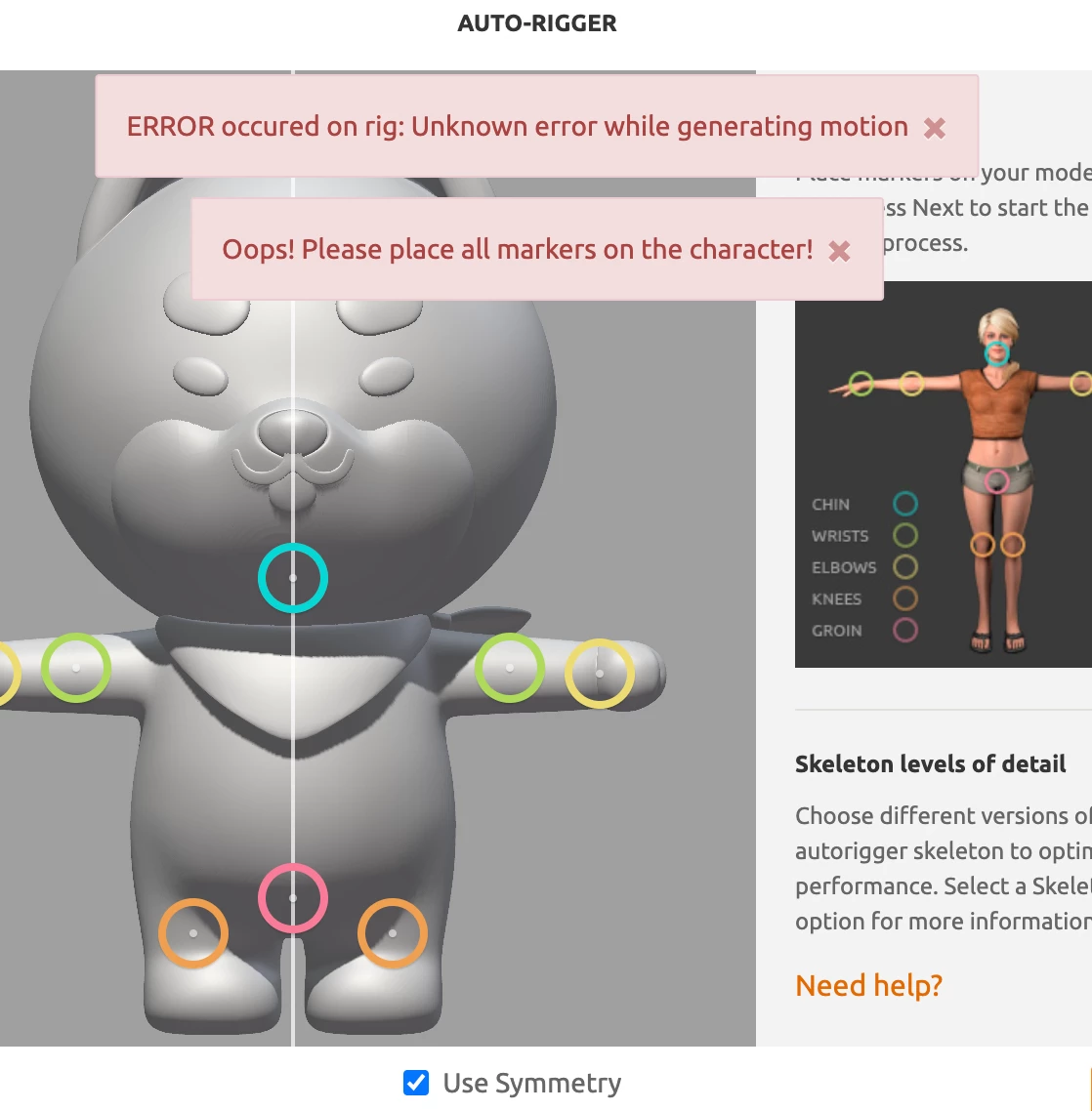 Nnecis266765661gwpParticipantForum|Forum|2 years agoMarch 27, 2023QuestionCan't auto rig with my characterForum|Forum|2 years agoMarch 27, 20231 reply160 viewsHi, here catch the error. UploadCharacter