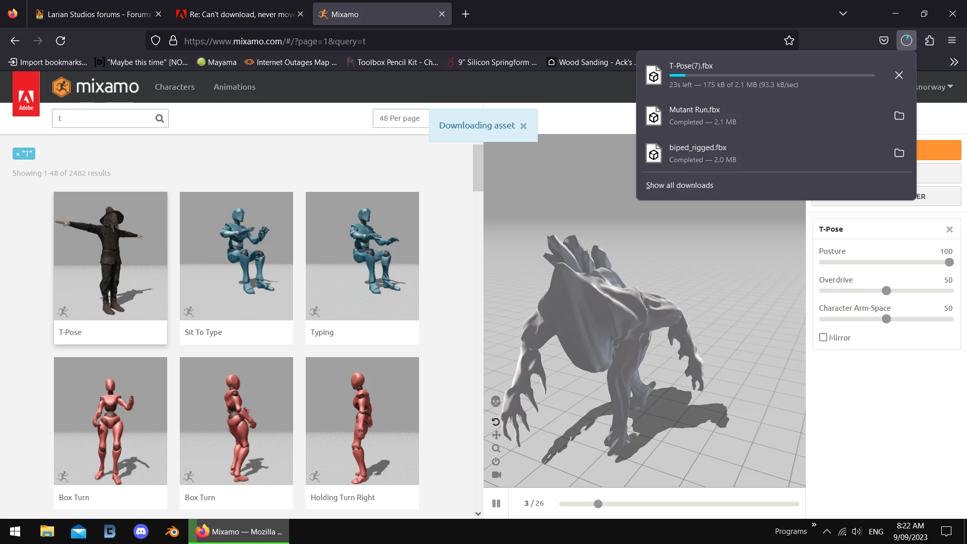 I have a mode on Mixamo that I was using and downlaoding animations for. Now I cannot get past the "Preparing Download. Just a momonet..." when I try to download either an aimation or just the T-pose mesh.