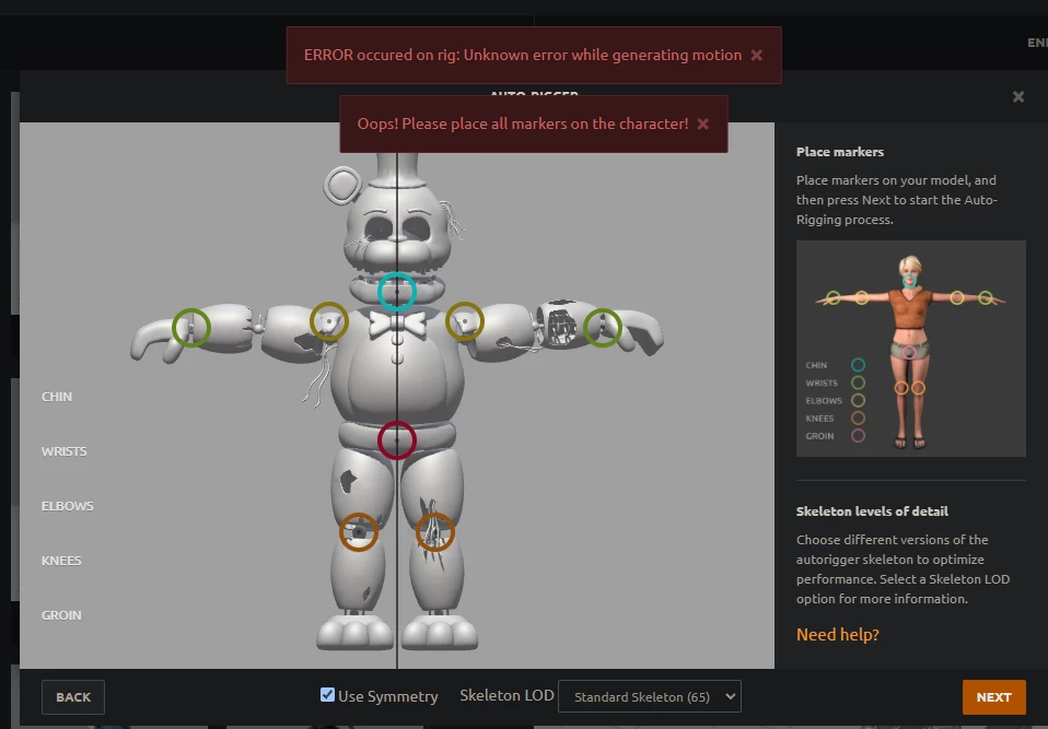 Hi, I have been trying to upload my 3d model to Mixamo and the auto-rigger keep gaving me this error
