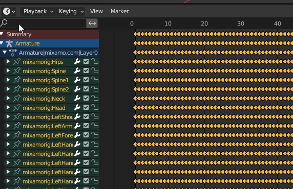 However, if I upload my own characters and download the animations on that character instead, the hips bone gets no animated track at all, and instead the fundamental position/rotation is animated on the Armature node itself. See images below.