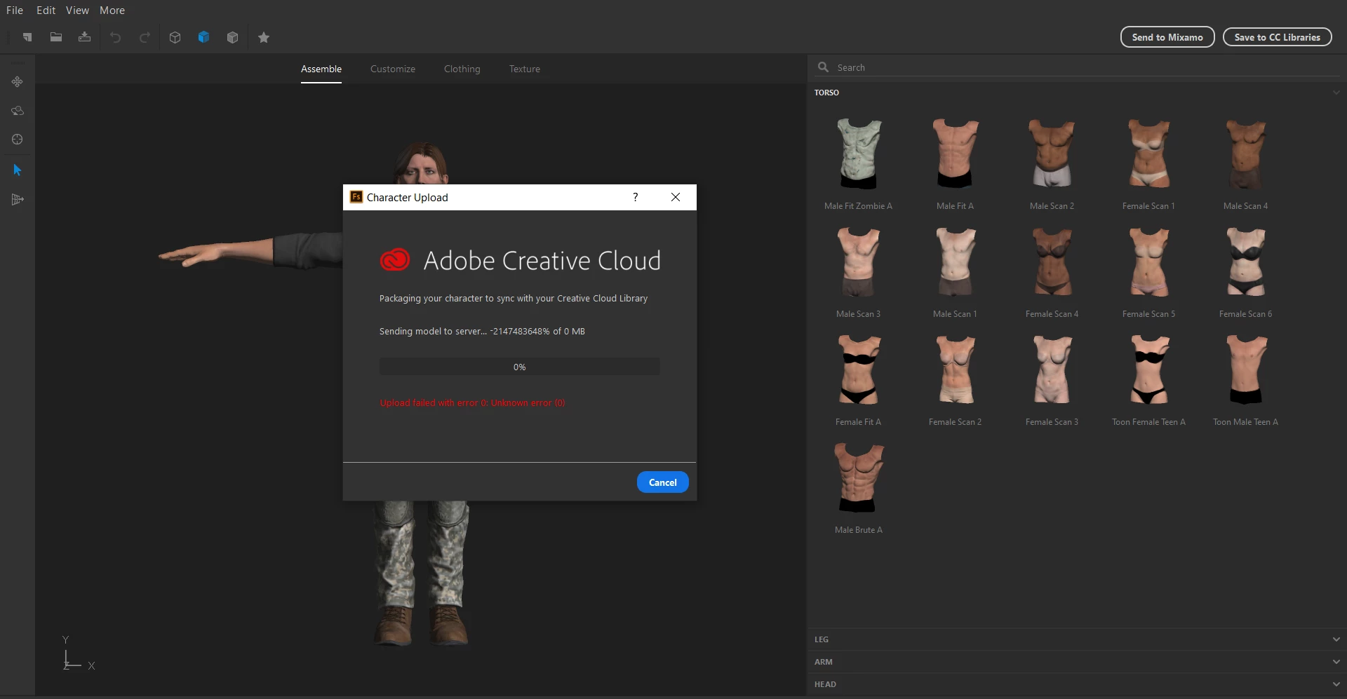 I tried to send the Fuse Model to Mixamo, but I could not. Now I'm trying to send it to CC Libraries and I cannot.