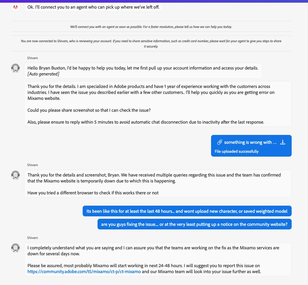 Mixamo has been down since the night of June 16th. I've been speaking with at least 10 different support people and they keep directing me to post here, and to wait 24-48 hours for responses/ fixes.